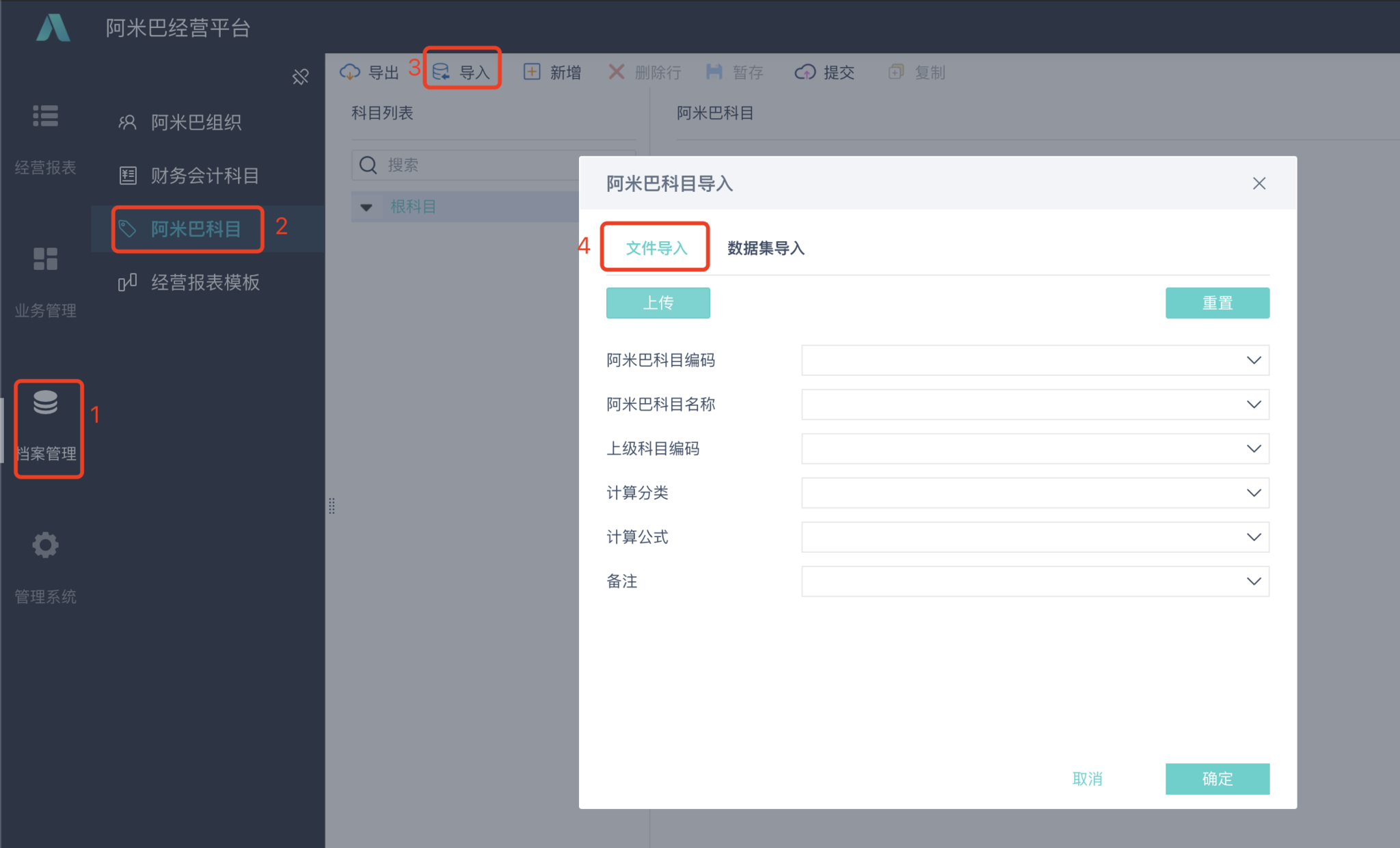 2.1 首先我们在「阿米巴科目」页面导入阿米巴科目: