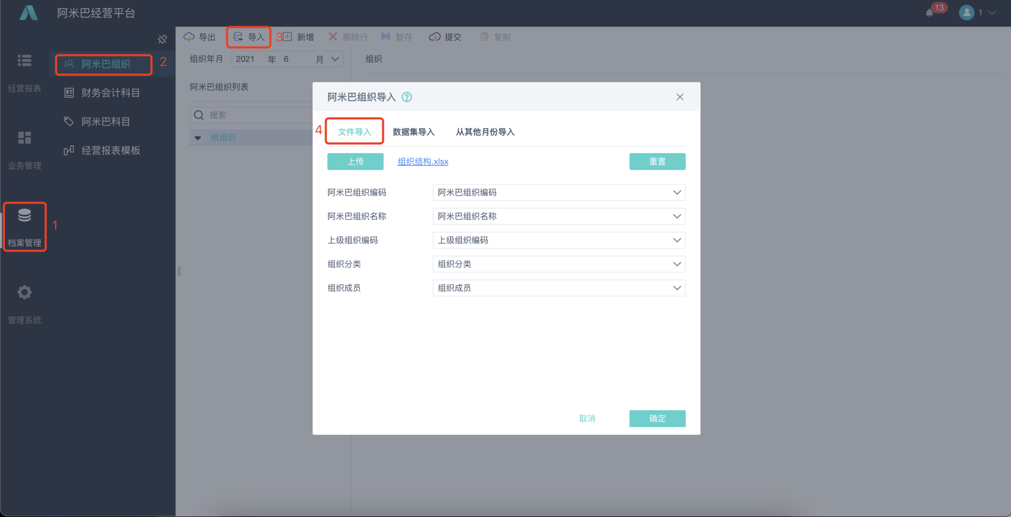 注意:在导入之前,需要先创建组织分类。组织分类用于确定核算报表显示的科目。
