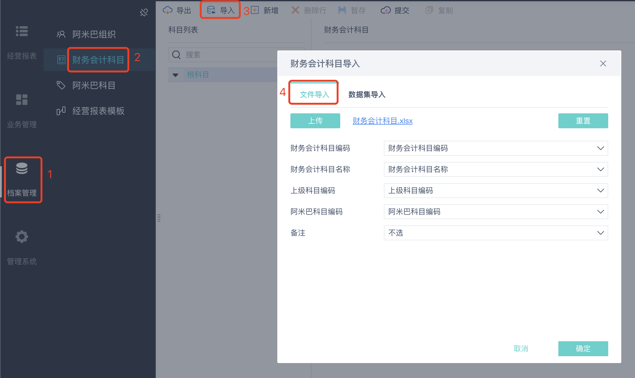 将财务会计科目整理成[ 财务会计科目编码|财务会计科目名称|上级科目编码|阿米巴科目编码 ]的结构,通过财务会计科目页面的导入按钮,导入财务会计科目。