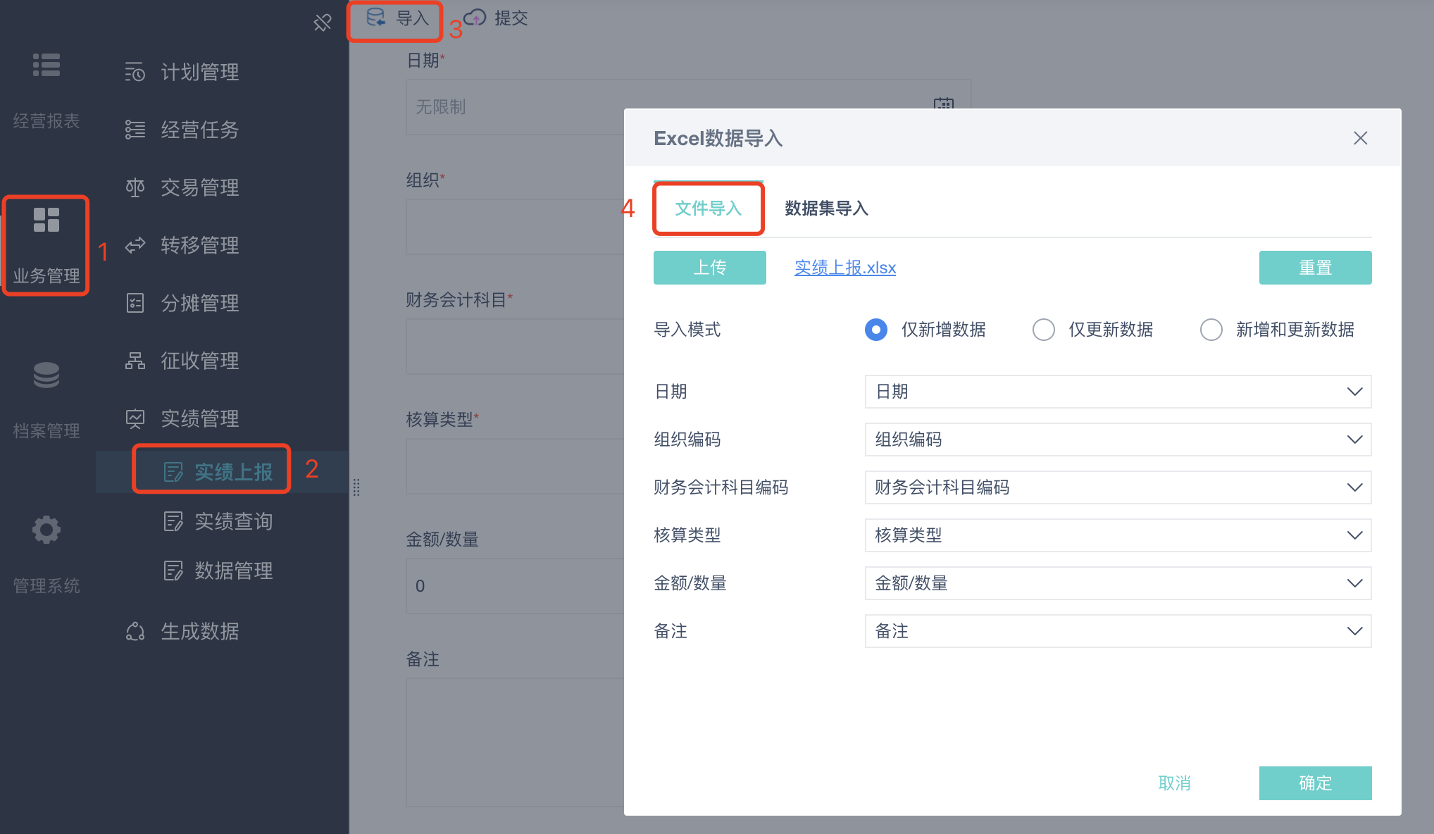 设置页面:业务管理-实绩管理-实绩上报