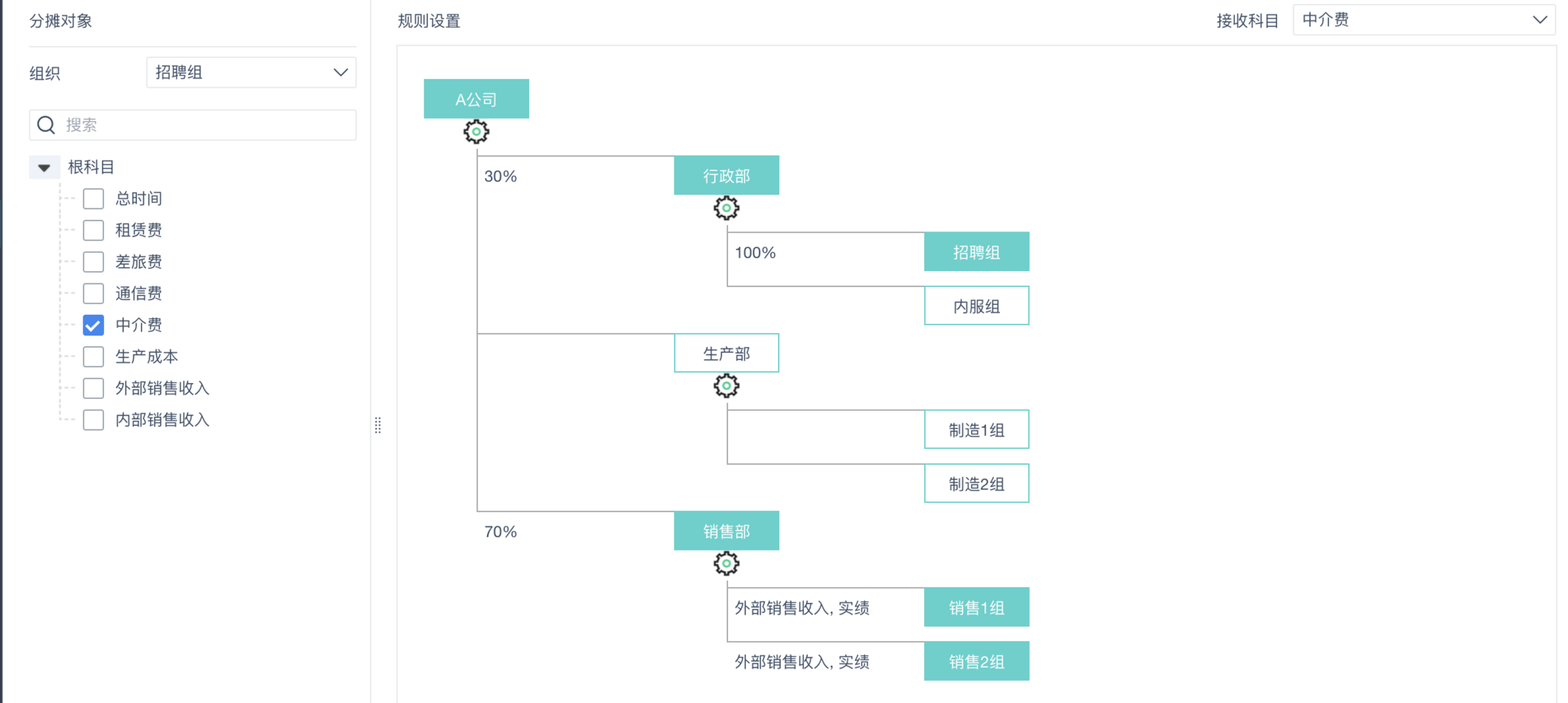 在核算过程中,有些组织的某些科目是公共科目,需要由其他组织共同承担,这时候需要用到分摊。比如招聘组6月为销售部进行招聘产生了一项中介费,该费用由招聘组对外支付,内部由招聘组和销售部两个组进行分摊。