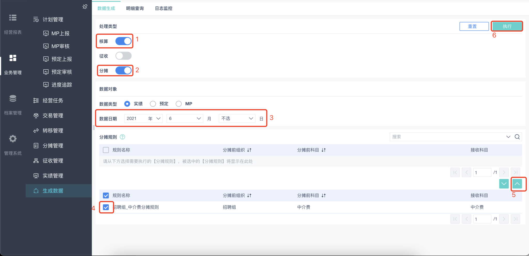 在以上的步骤中,我们先后完成了财务数据引入、内部交易、分摊。这一步要做的是把上述所有数据最终核算到各组织的科目中,生成阿米巴科目的数据,也就是我们最终在核算报表上看到的数据。