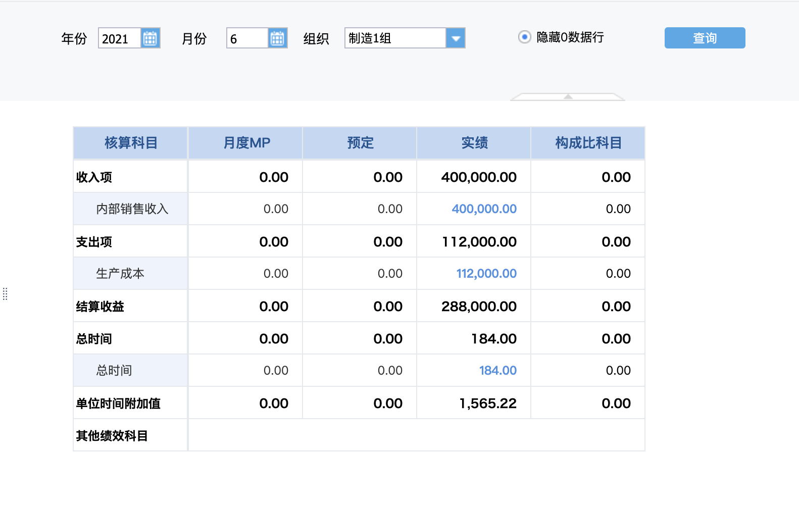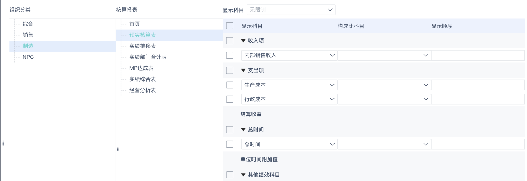 导入后,可看到不同组织分类在各核算报表下显示的科目,以[制造-预实核算表]举例: