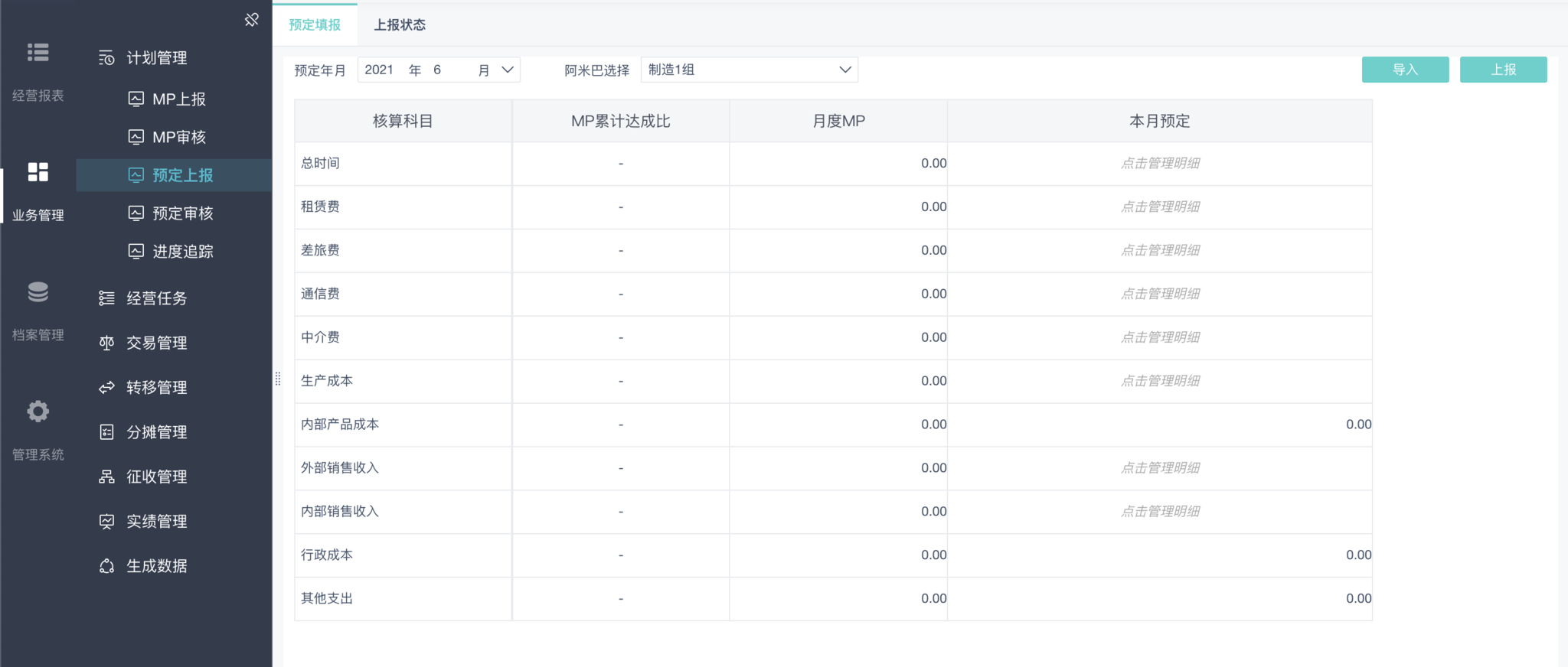 计划管理包括MP、预定,MP即年度计划、预定为月度计划,计划上报审核后,可进行进度追踪、报表核算参考。