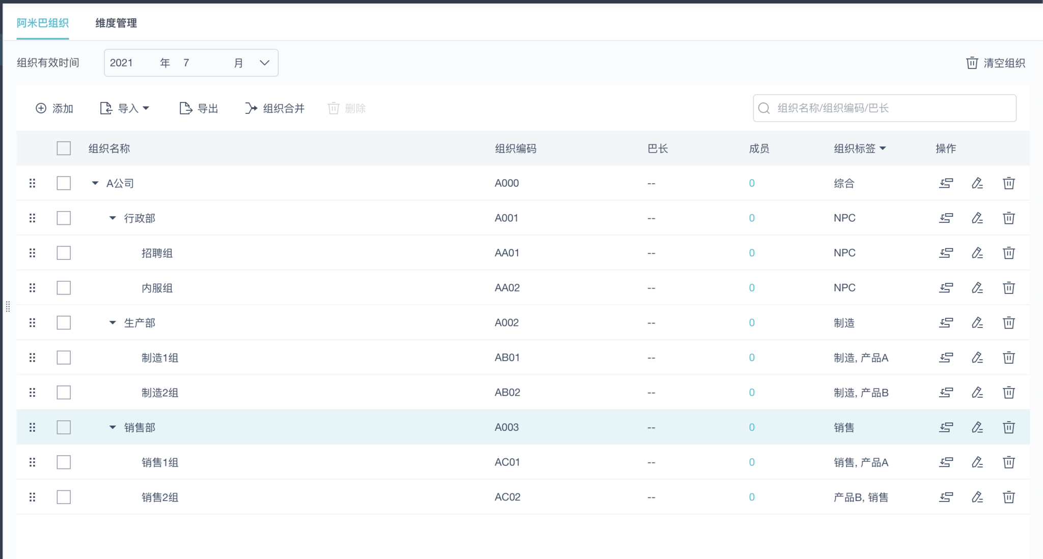 维度创建完成后,将上述组织整理成 [ 组织编码|组织名称|上级组织编码|组织标签|标签所属维度 ]的结构,通过阿米巴组织页面中的导入按钮,将组织导入。