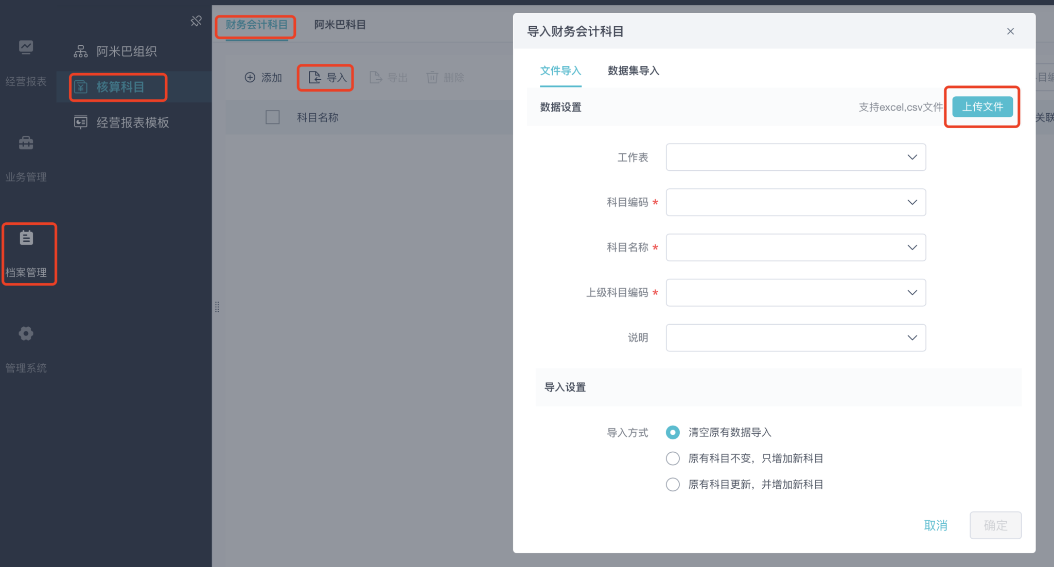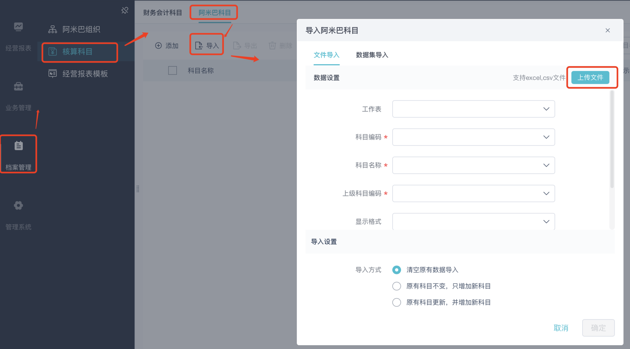 2.2 然后我们在「核算科目-阿米巴科目」页面导入阿米巴科目: