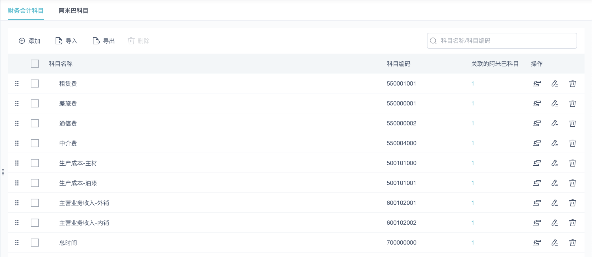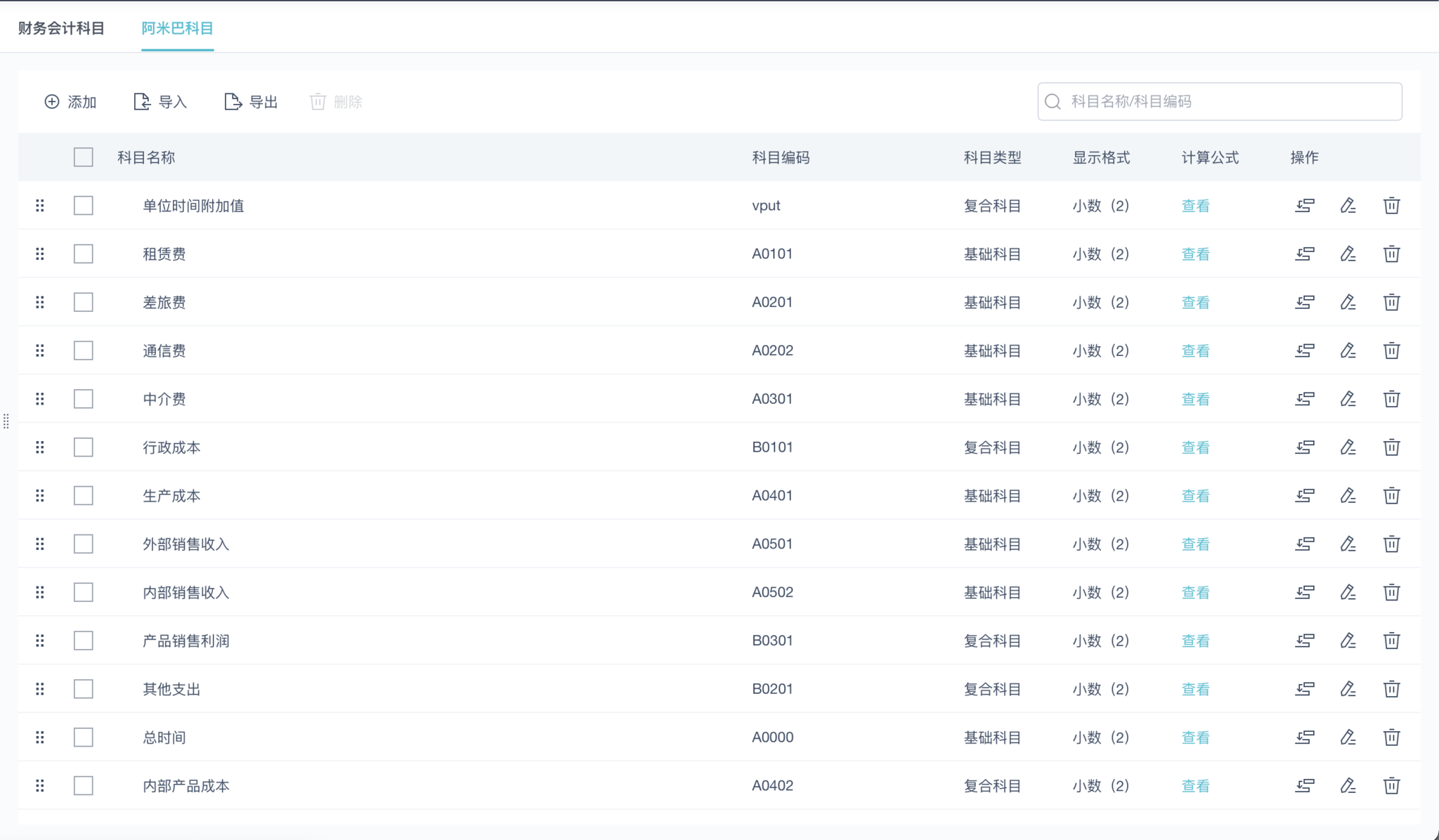导入完成后,财务会计科目、阿米巴科目显示如下: