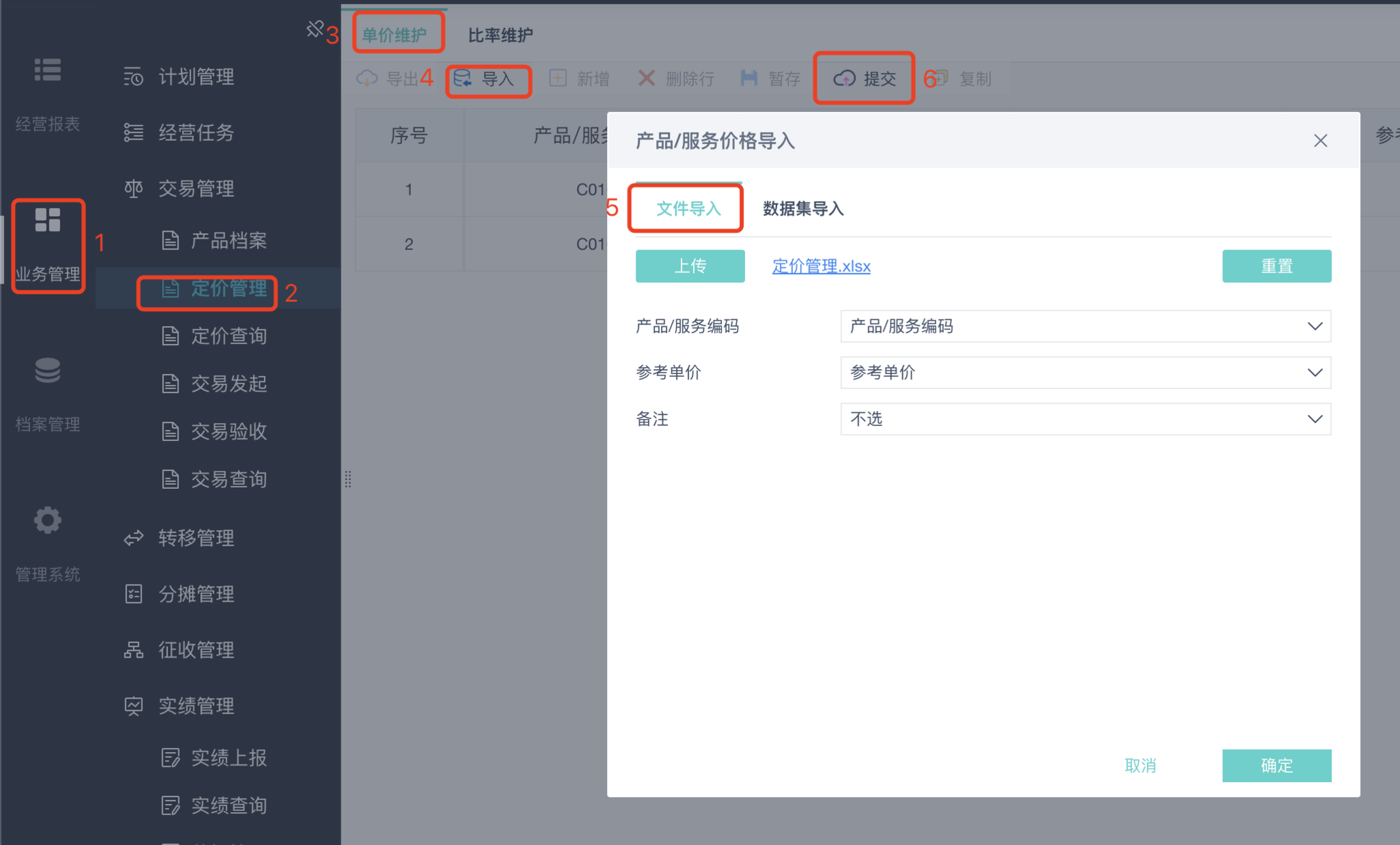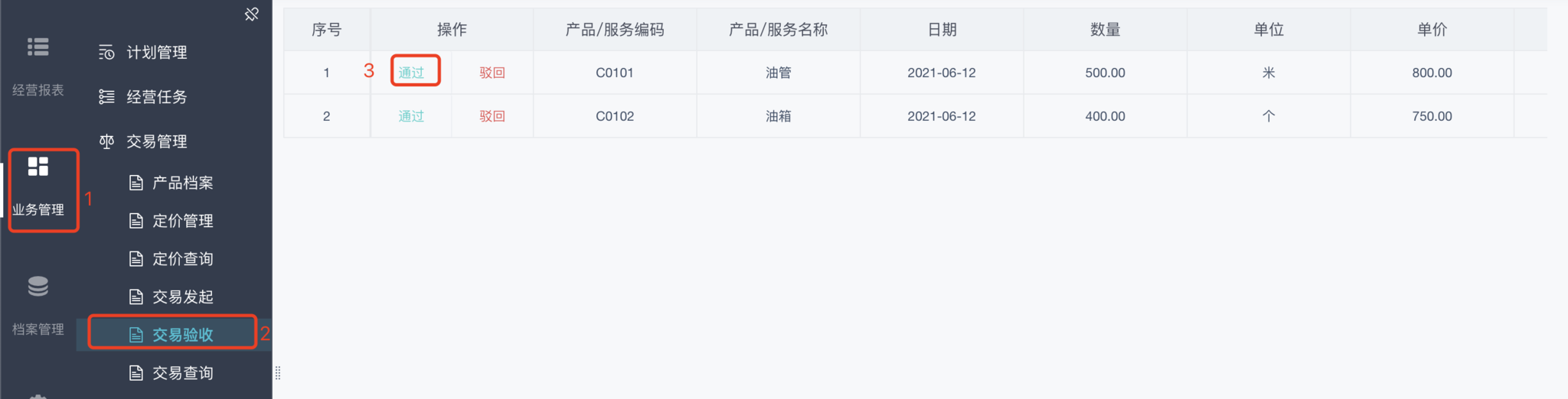 设置界面:业务管理-交易管理-产品档案/定价管理/定价查询/交易发起/交易验收