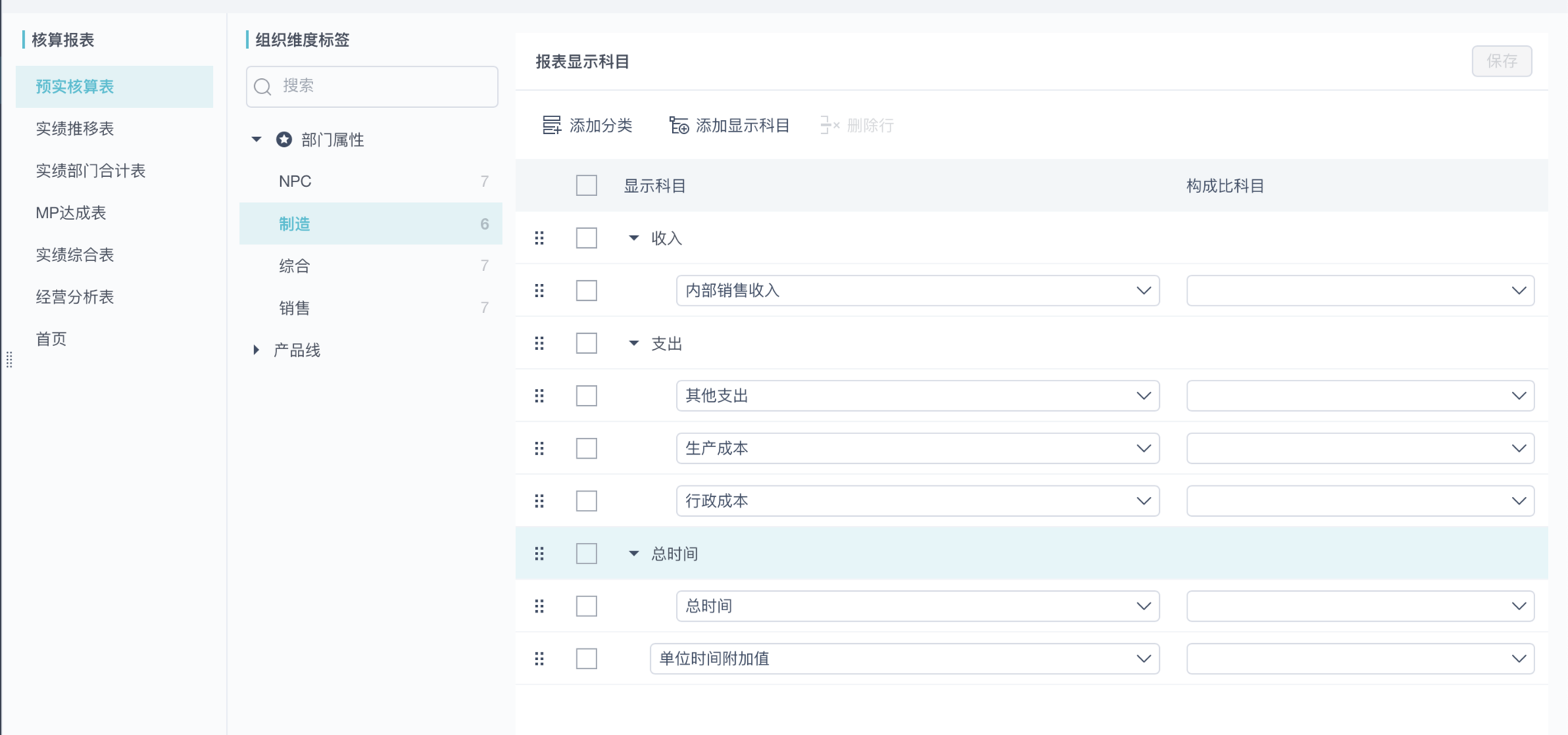 导入后,可看到不同组织分类在各核算报表下显示的科目,以[预实核算表-制造]举例: