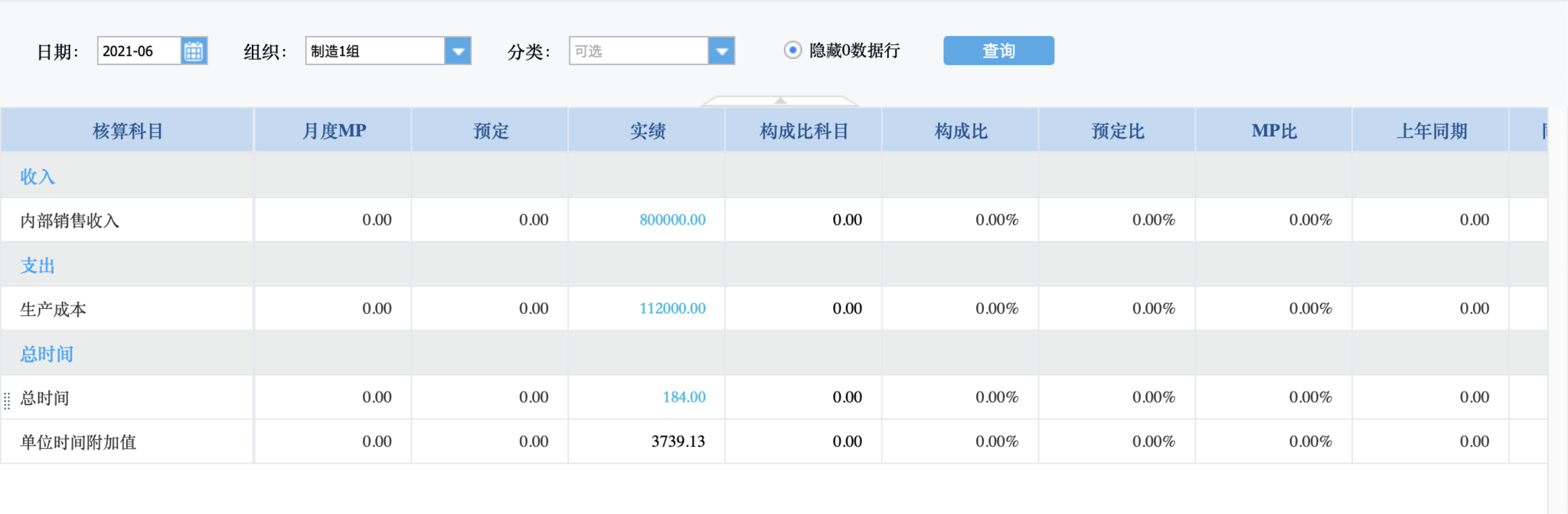 点击「经营报表」-「经营核算」-「预实核算表」,选择制造1组(分类不选),即可看到它的核算报表。和我们在前面配置的显示内容相同。