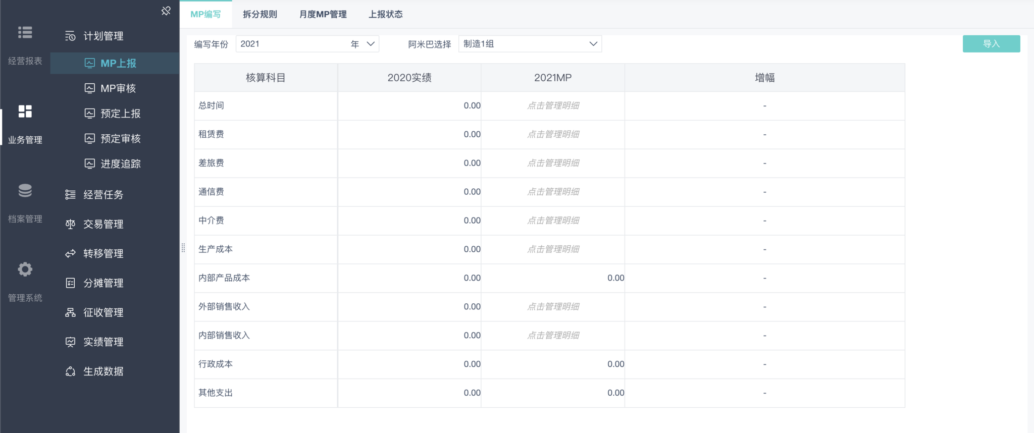 计划管理包括MP、预定,MP即年度计划、预定为月度计划,计划上报审核后,可进行进度追踪、报表核算参考。