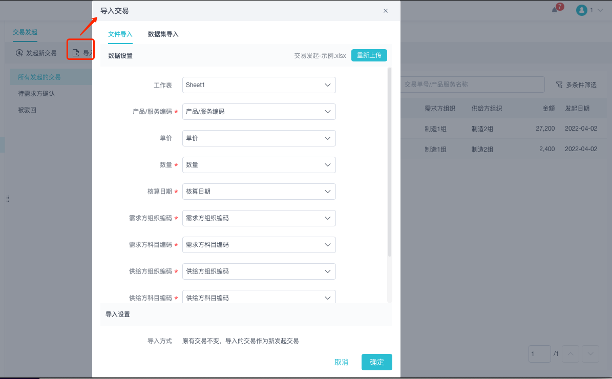 直接上传示例文件,点击确定即可。新导入的交易将作为新发起交易。 注意示例文件中核算日期是和阿米巴组织中组织所在月份匹配的,如果导入出错,请确认日期是否匹配。 ![]() |