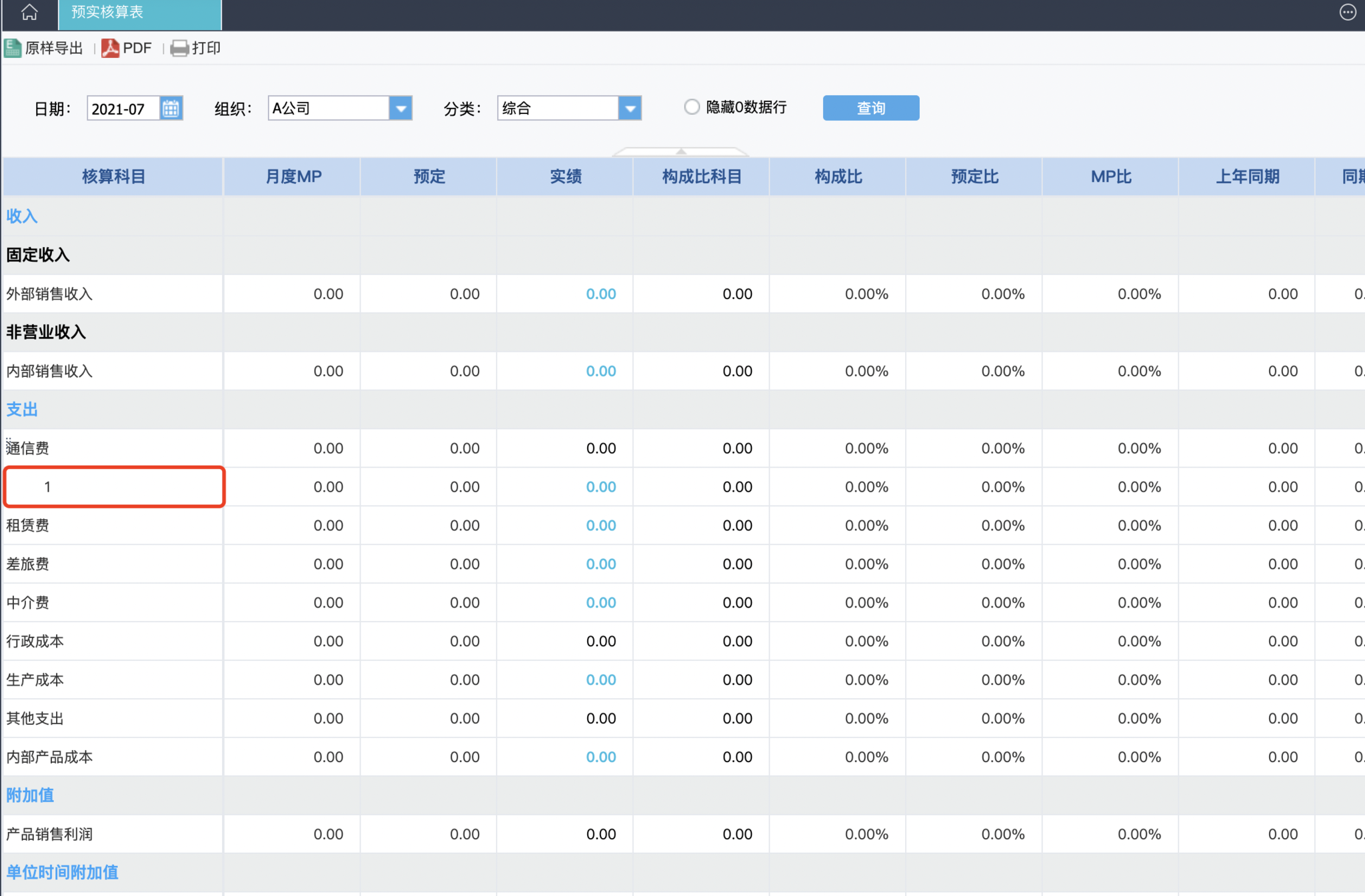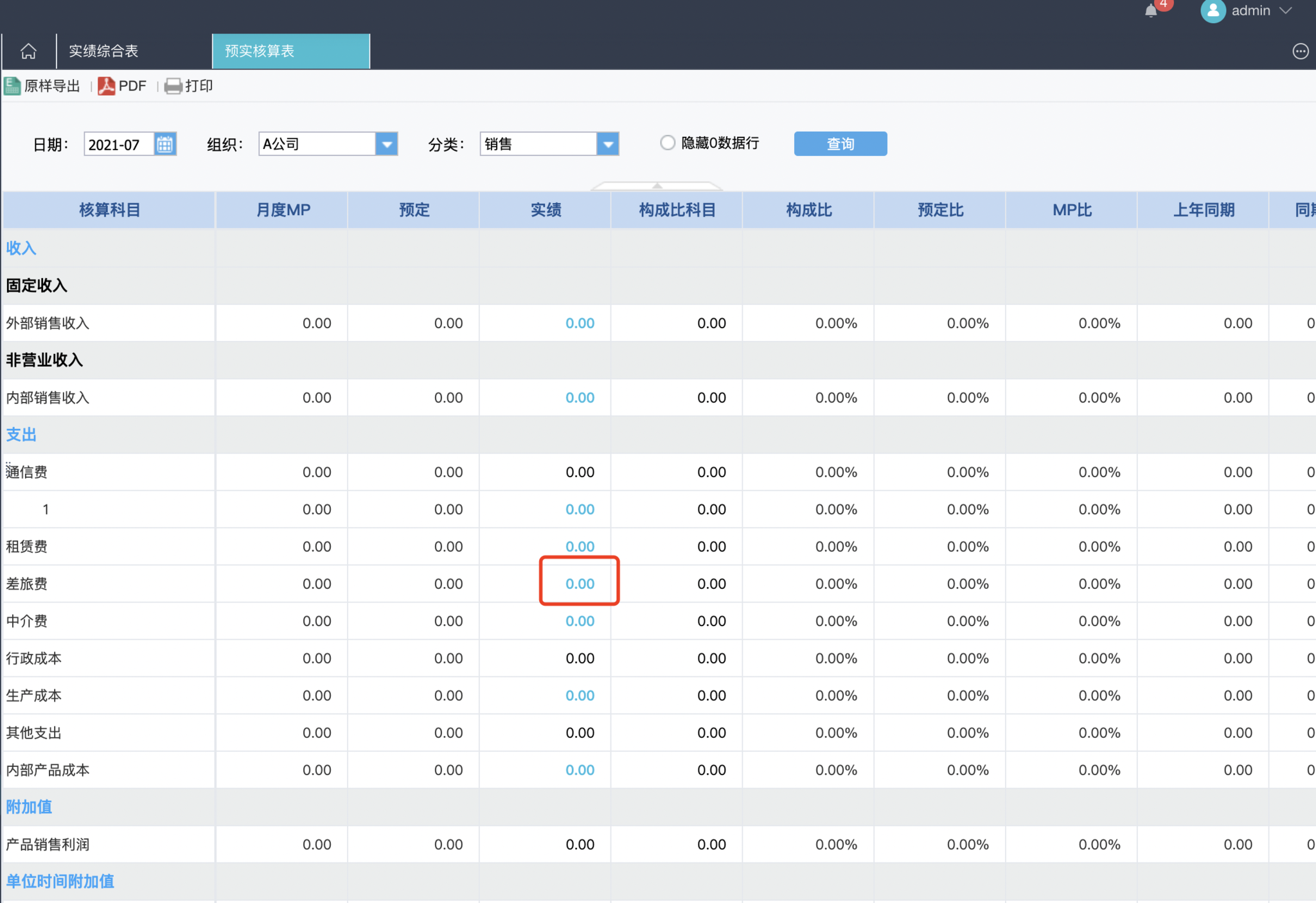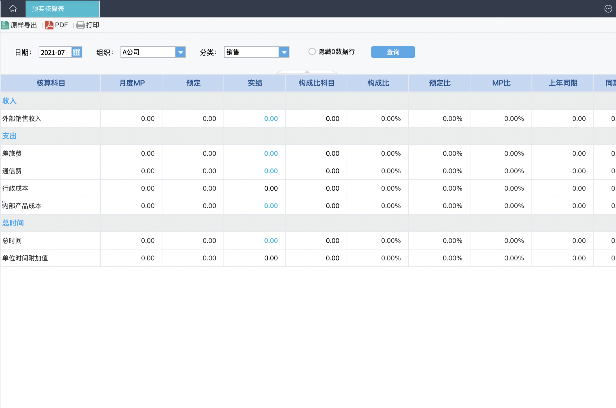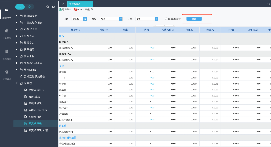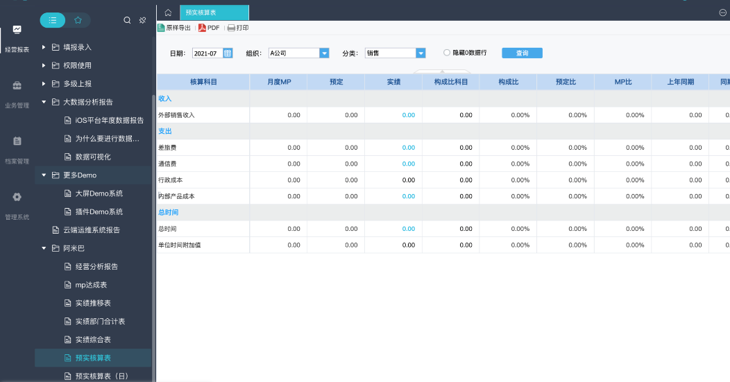 此时展示的预实核算表即为7月份,A公司组织,分类为销售标签的预实核算表---具体的核算科目和我们在档案管理-经营报表模版中配置的科目是一致的。