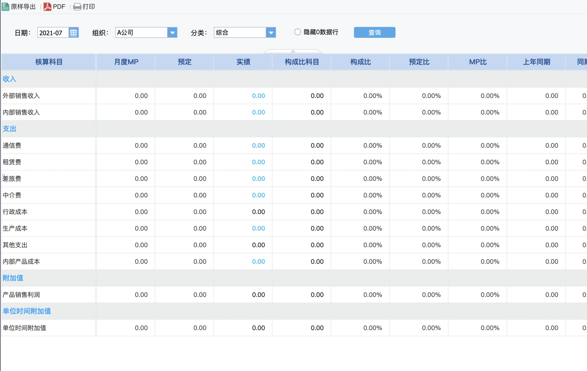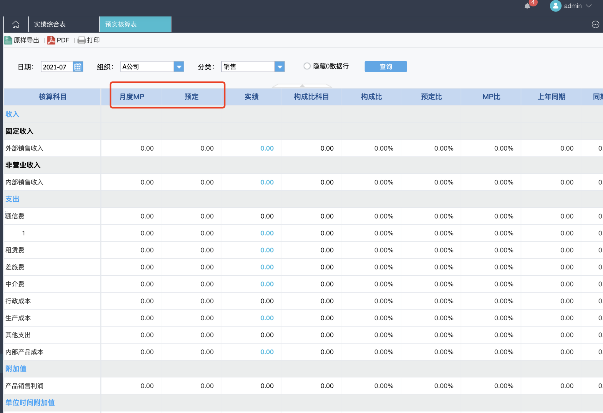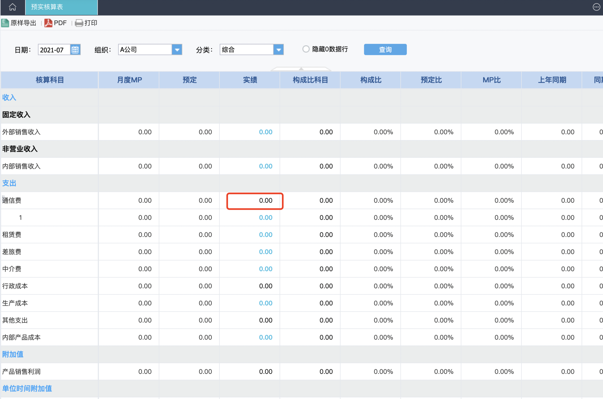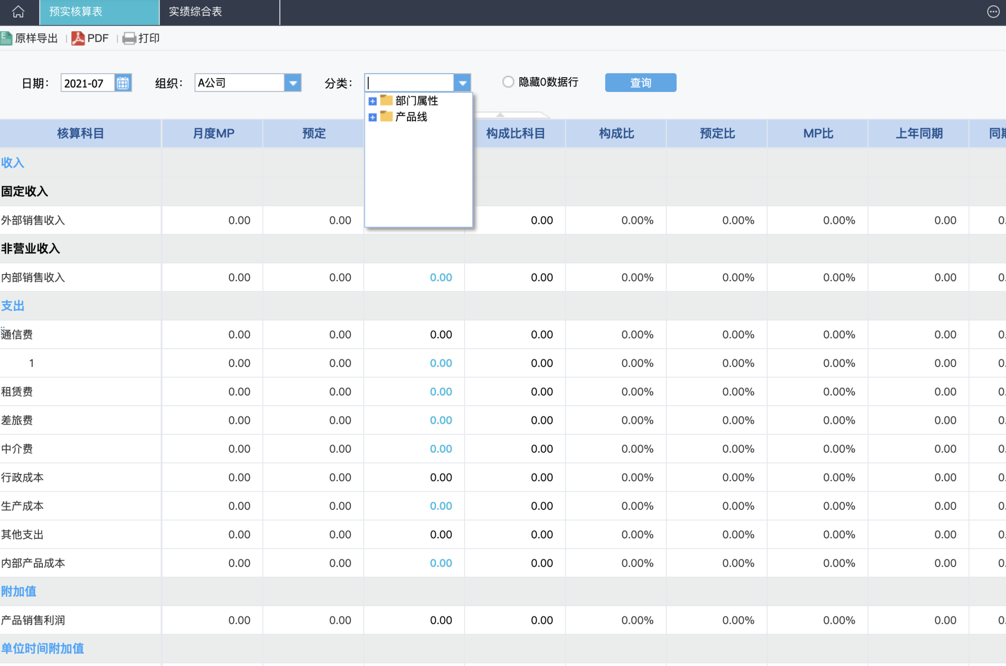 此时展示的预实核算表即为7月份,A公司组织,分类为销售标签的预实核算表---具体的核算科目和我们在档案管理-经营报表模版中配置的科目是一致的。