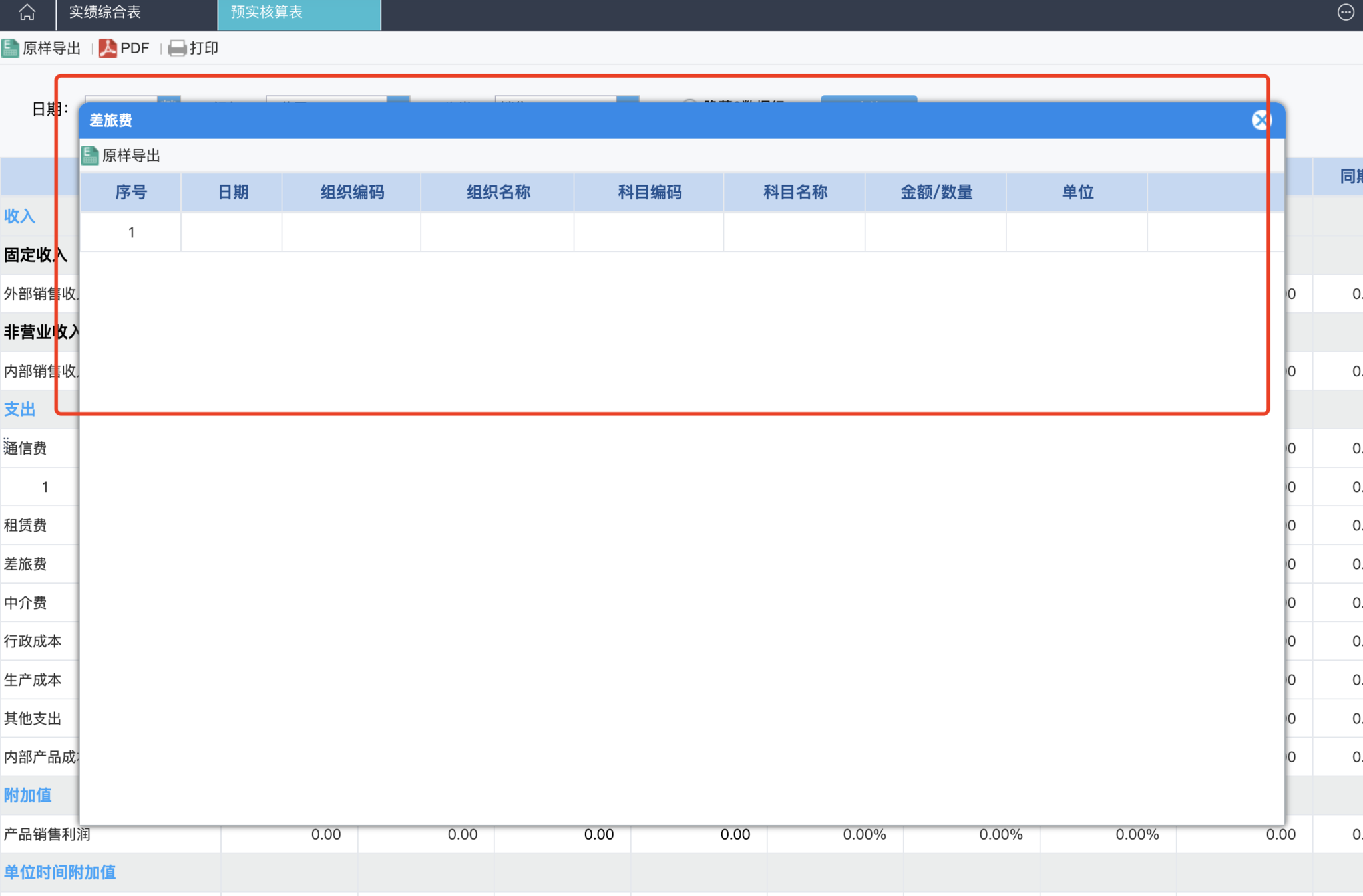在实际管理中填报的实际数据和我们导入或从各个系统中(erp,mes,oa,金蝶,用友等)抽调的数据会自动核算到我们的表中,我们的一级科目是可以下钻,看到我们的实绩明细的,例如: