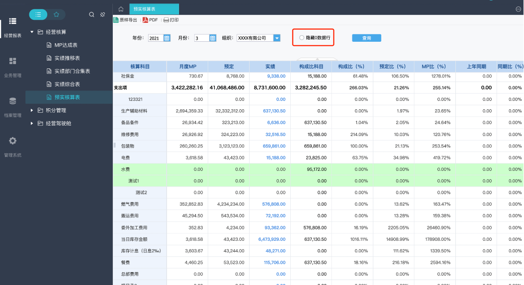 在预实核算表中,会显示我们对应科目的mp和预定值,以便我们在比较计划实际的一个达成情况,表中有预定比,mp比来作为指标衡量。