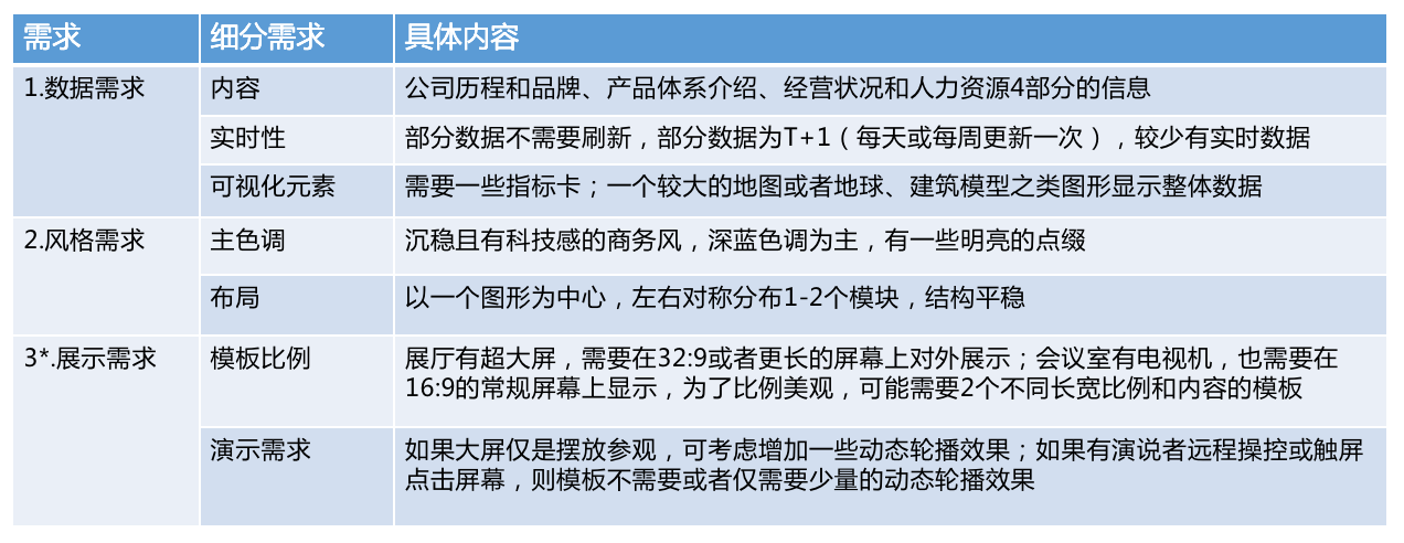 在大屏需求规划阶段,我们就要了解清楚大屏的使用方式,分析展示需求,决定大屏是否需要一些动态效果。