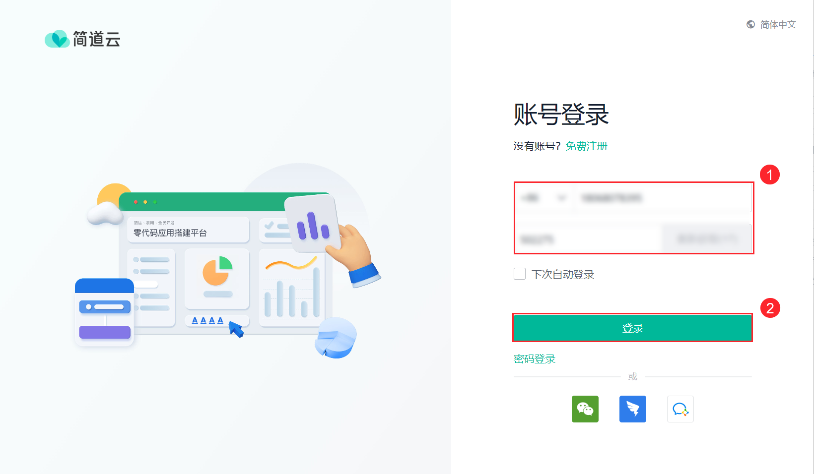 2)在登录页,输入简道云企业创建者的「账号+密码」,输入后点击「登录」。如下图所示: