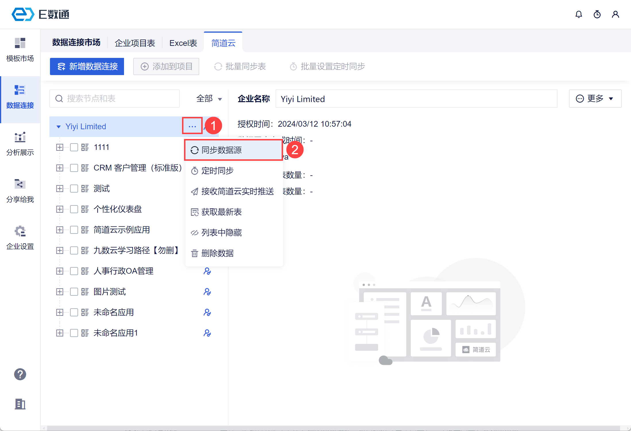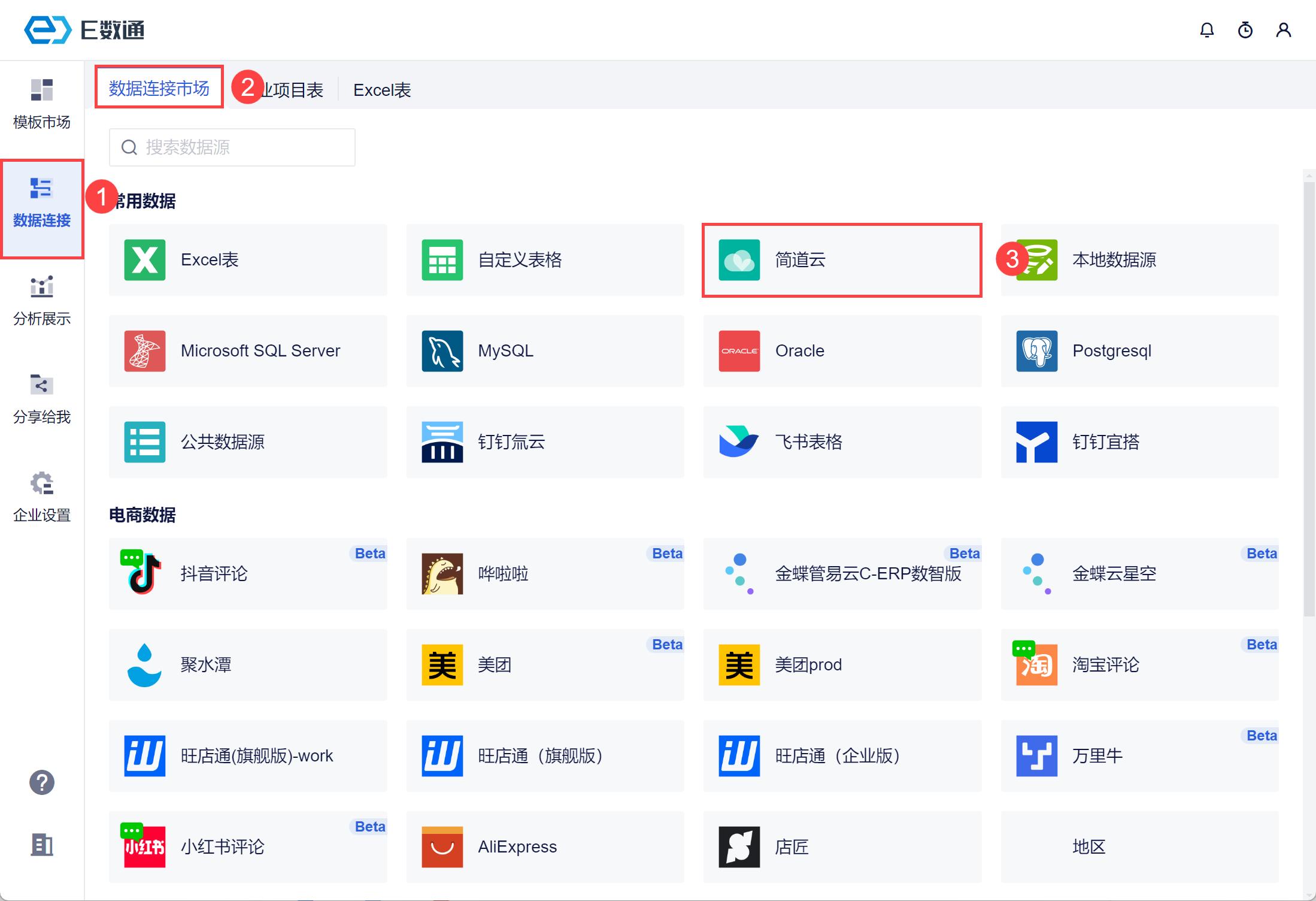 E 数通支持获取简道云数据源,轻松进行海量数据的处理和分析。