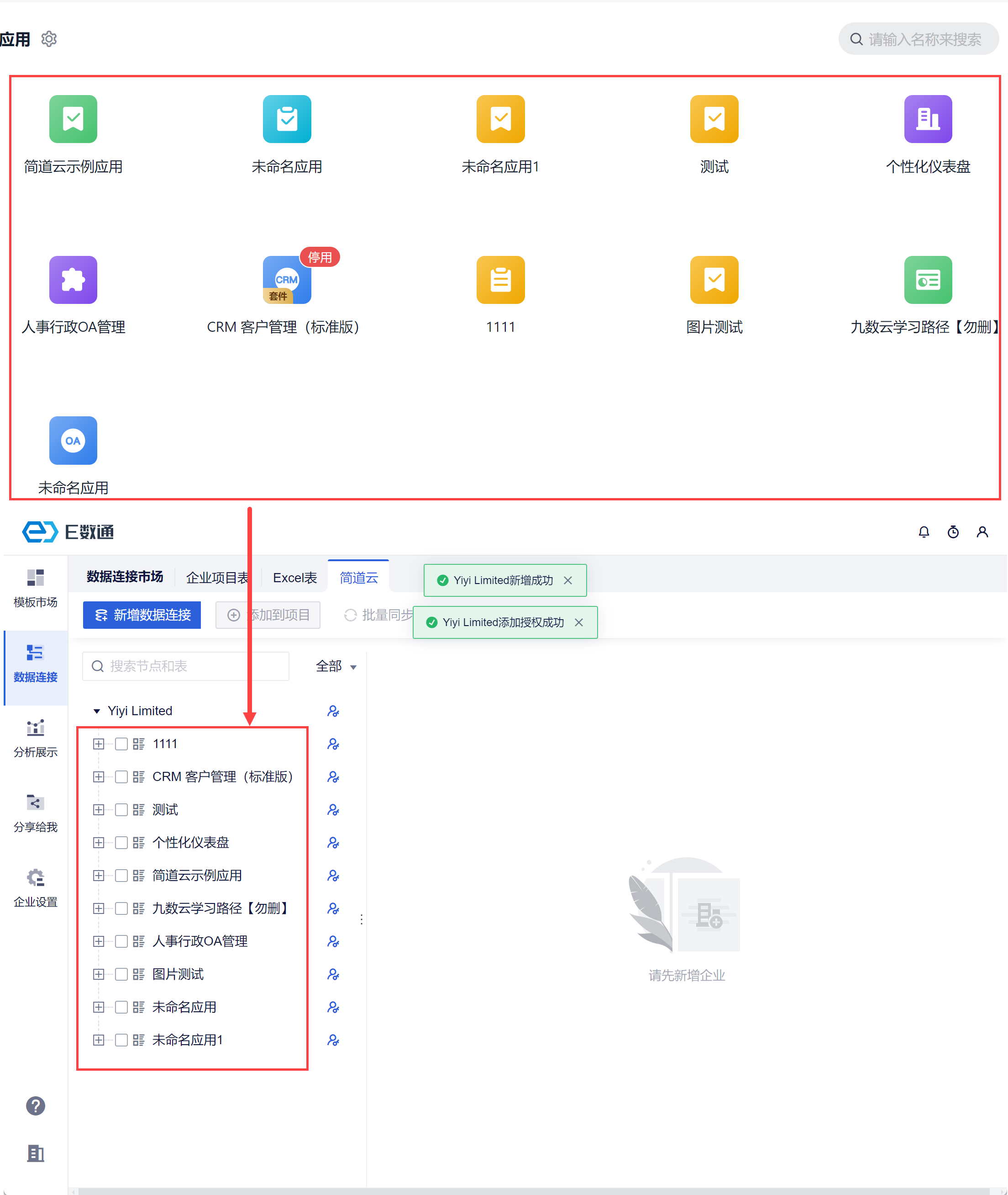 5)回到 E 数通后,在左侧可以看到数据列表。将简道云应用中的数据都获取至 E 数通了。如下图所示: