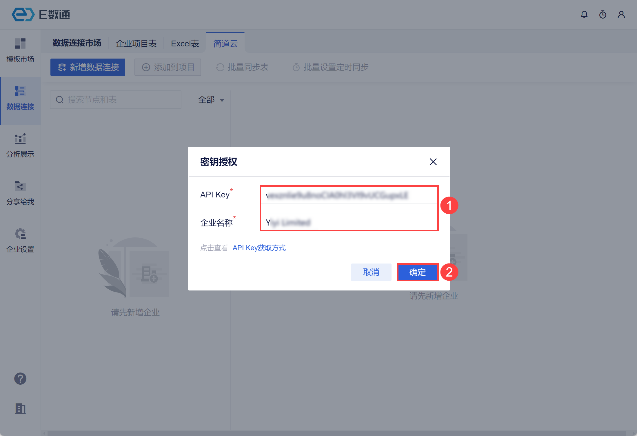 3)复制 API Key,回到 E 数通中,填写「API Key」和「企业名称」,点击「确定」,如下图所示: