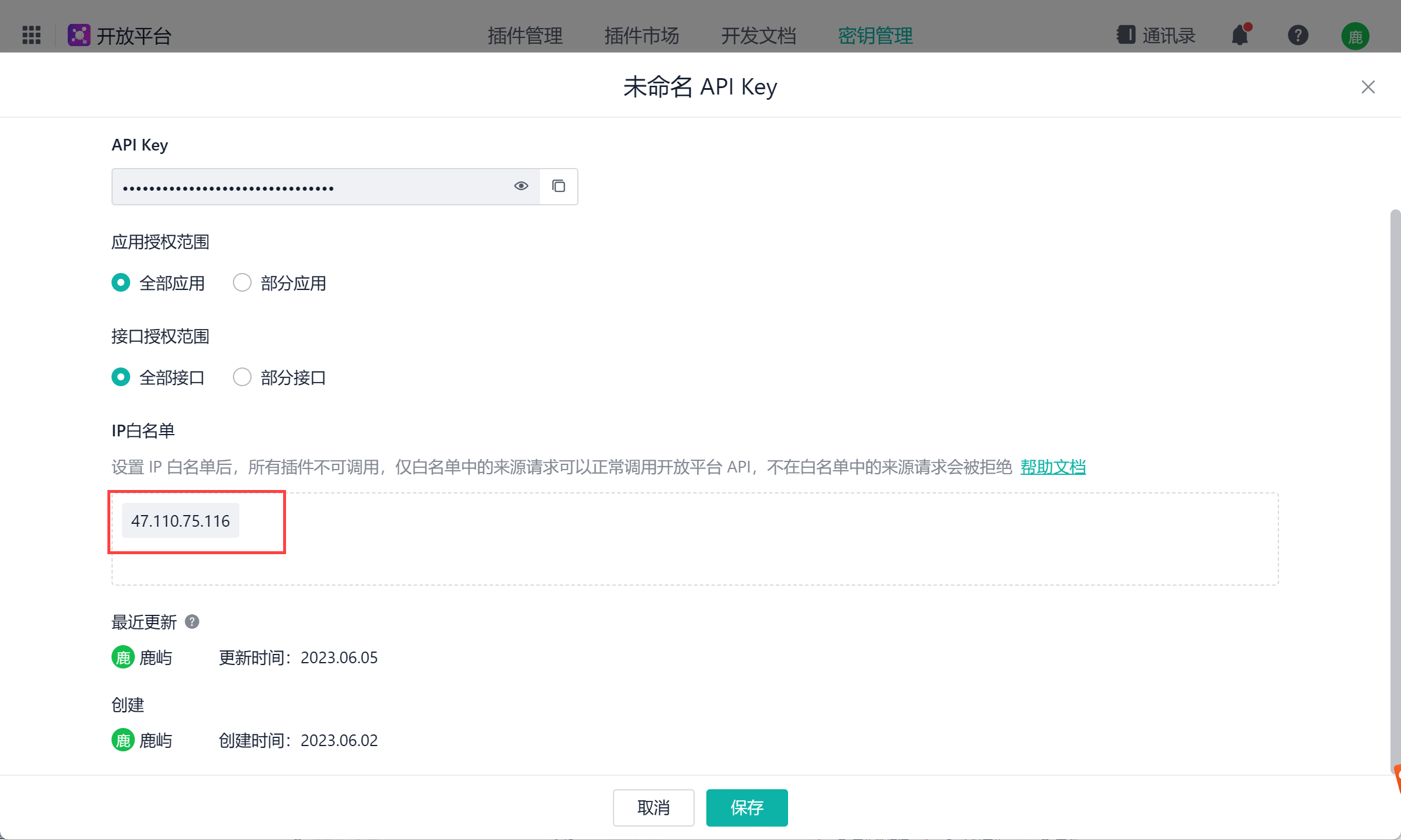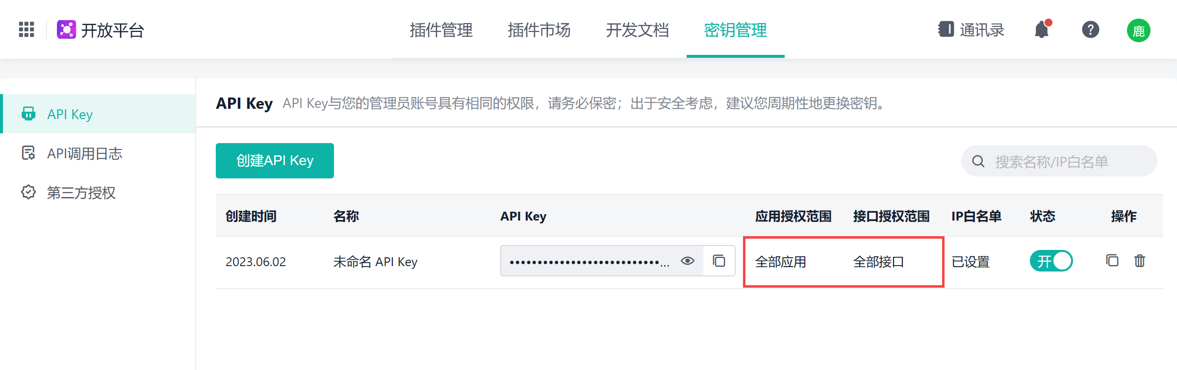 | 密钥授权 | 在简道云平台中创建一个 API Key,在授权时输入「API Key+企业名称」,完成授权。 | 简道云企业开通了 API 功能; |