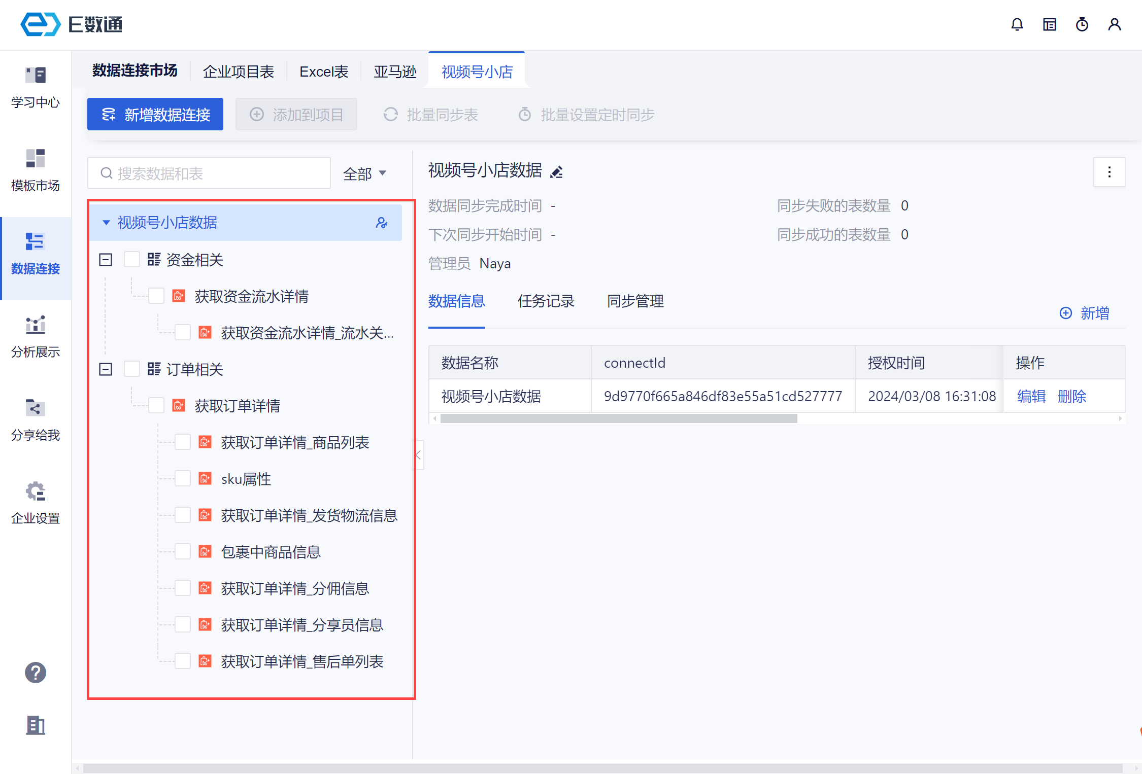 E 数通支持直接与「视频号小店」平台对接,将直播相关的资金数据、商品订单数据获取至 E 数通进行分析。