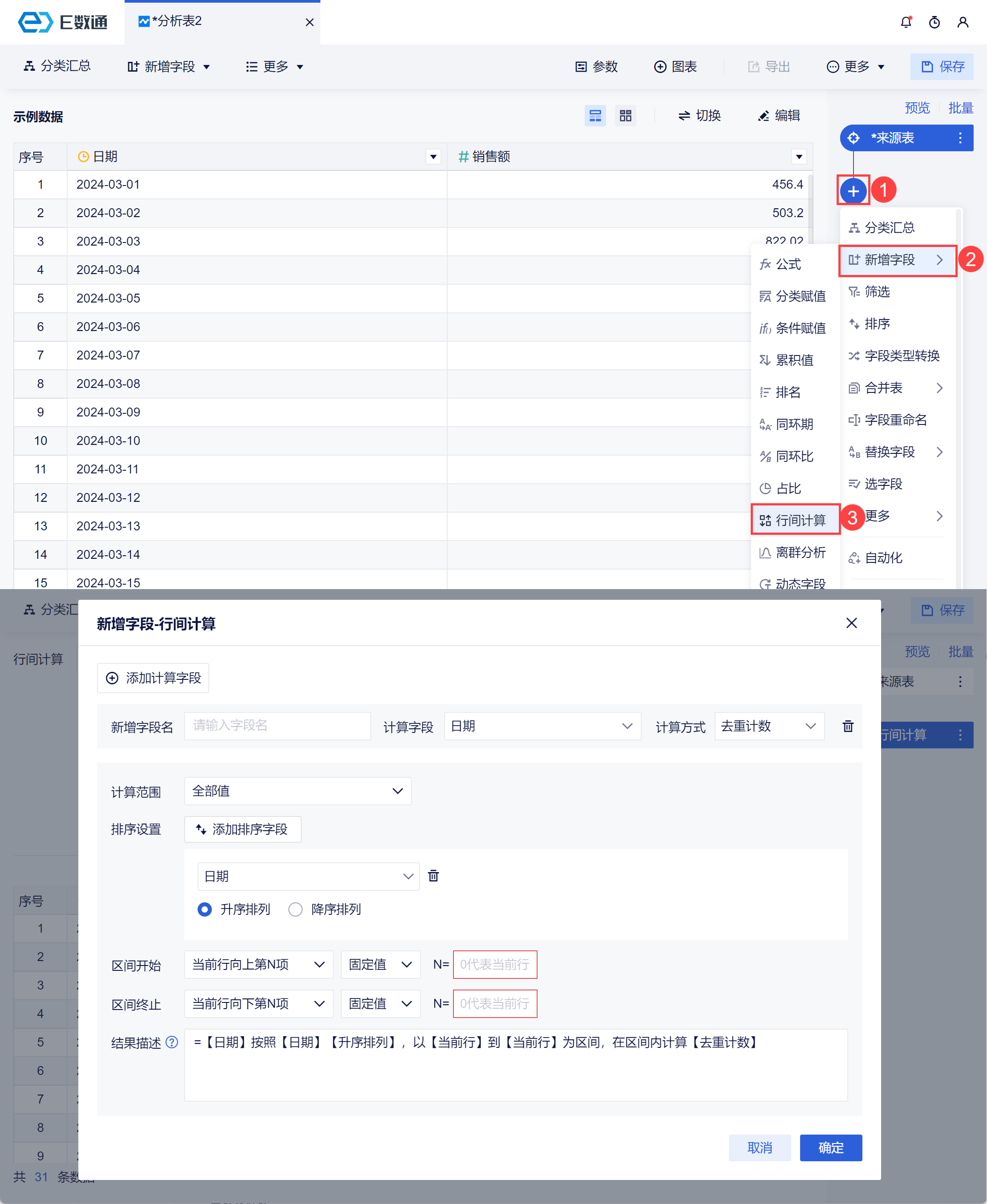 新增「行间计算」功能,通过可视化的配置界面,可以轻松解决移动平均、移动求和、错行取数等场景。简化复杂数据处理,提高分析效率。