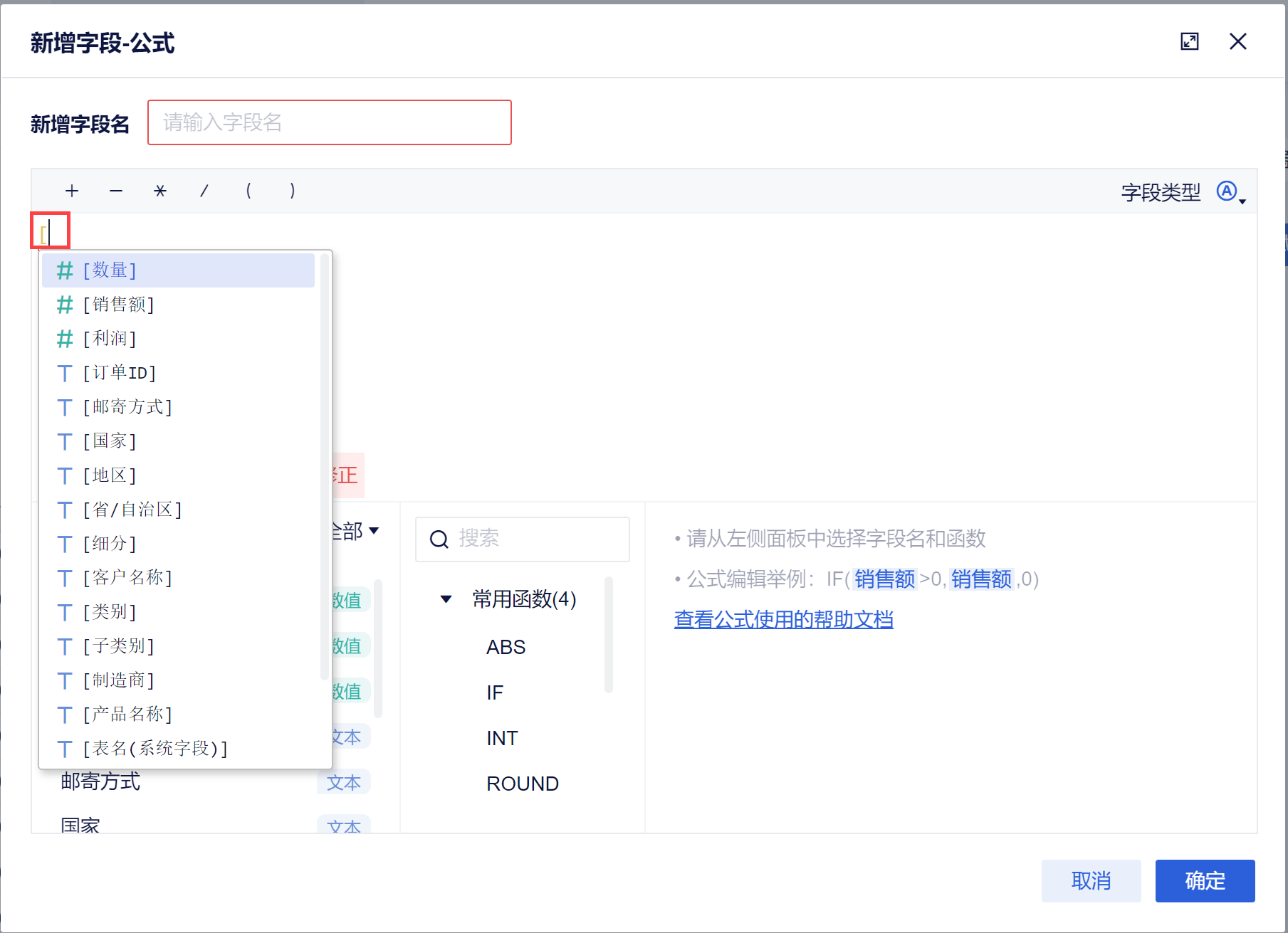 2)在编辑框中输入 [ ,在列表中会展示当前可以使用的字段,方便用户选择字段。如下图所示: