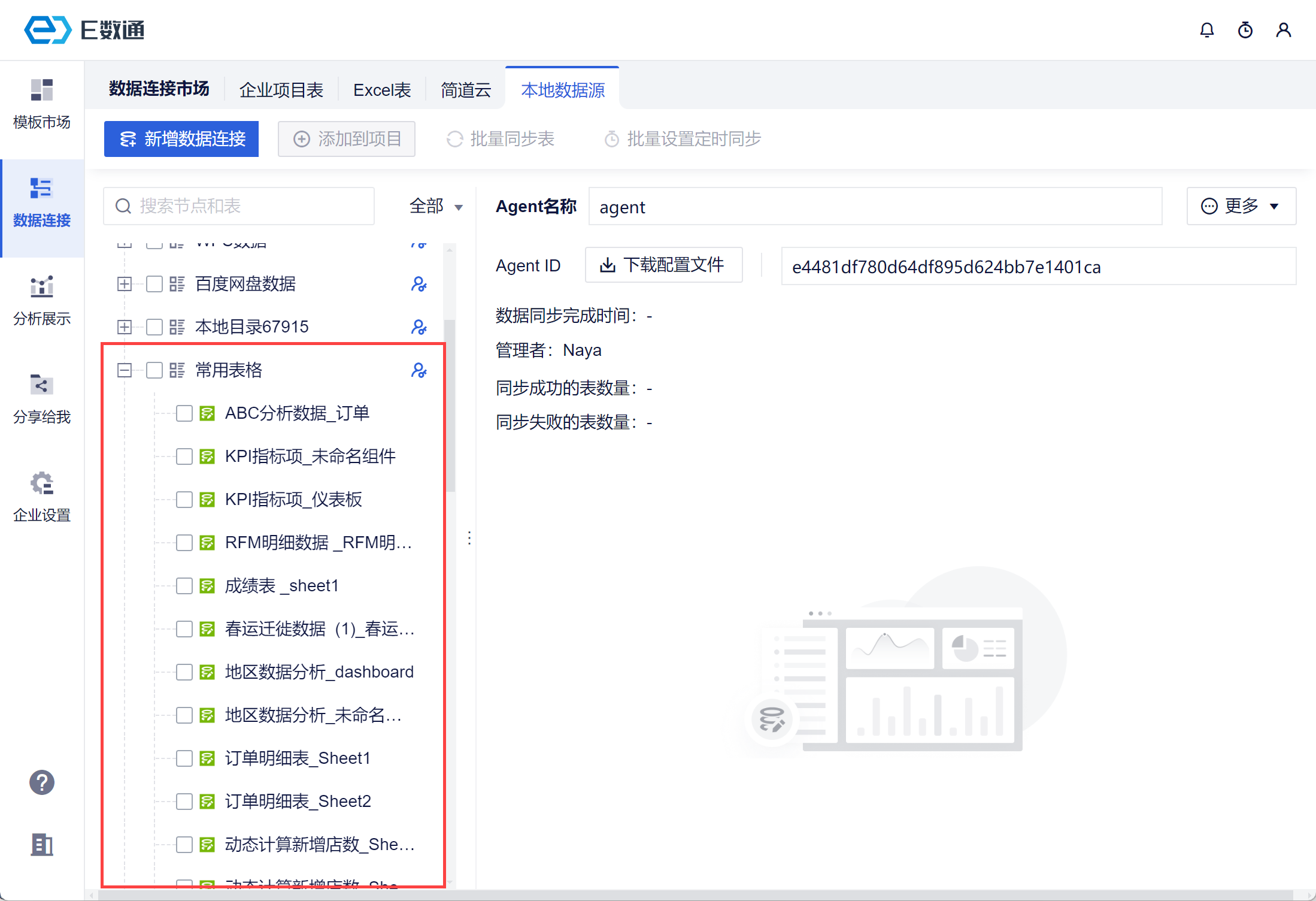 用户需要将本地的 Excel 数据上传至 E数通中进行分析,但本地数据会经常更新。如果一个个更新数据,会耗费很多时间。