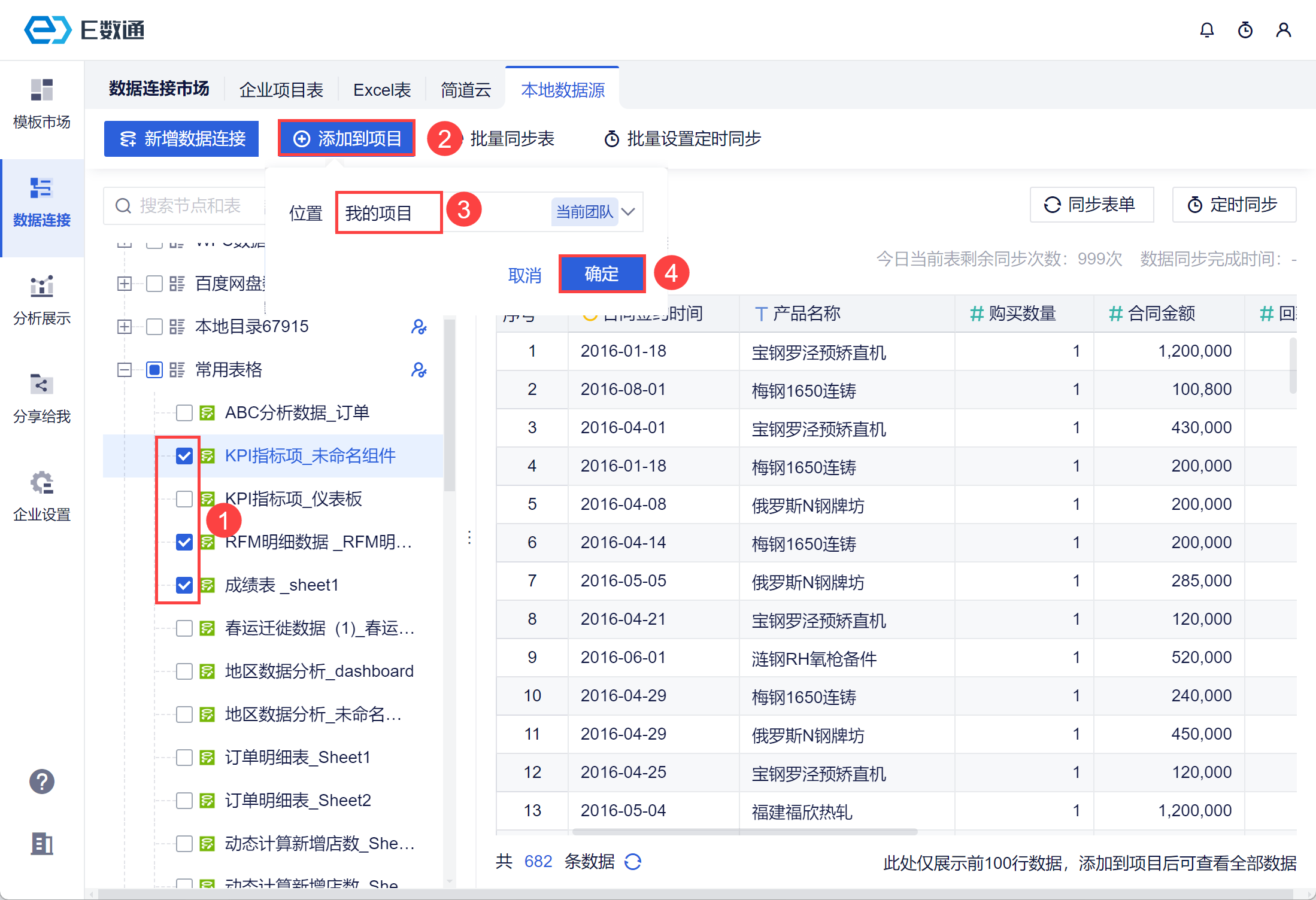 连接好数据源并同步数据后,下一步,需要将数据保存在「分析展示」模块的项目中,进一步地分析。