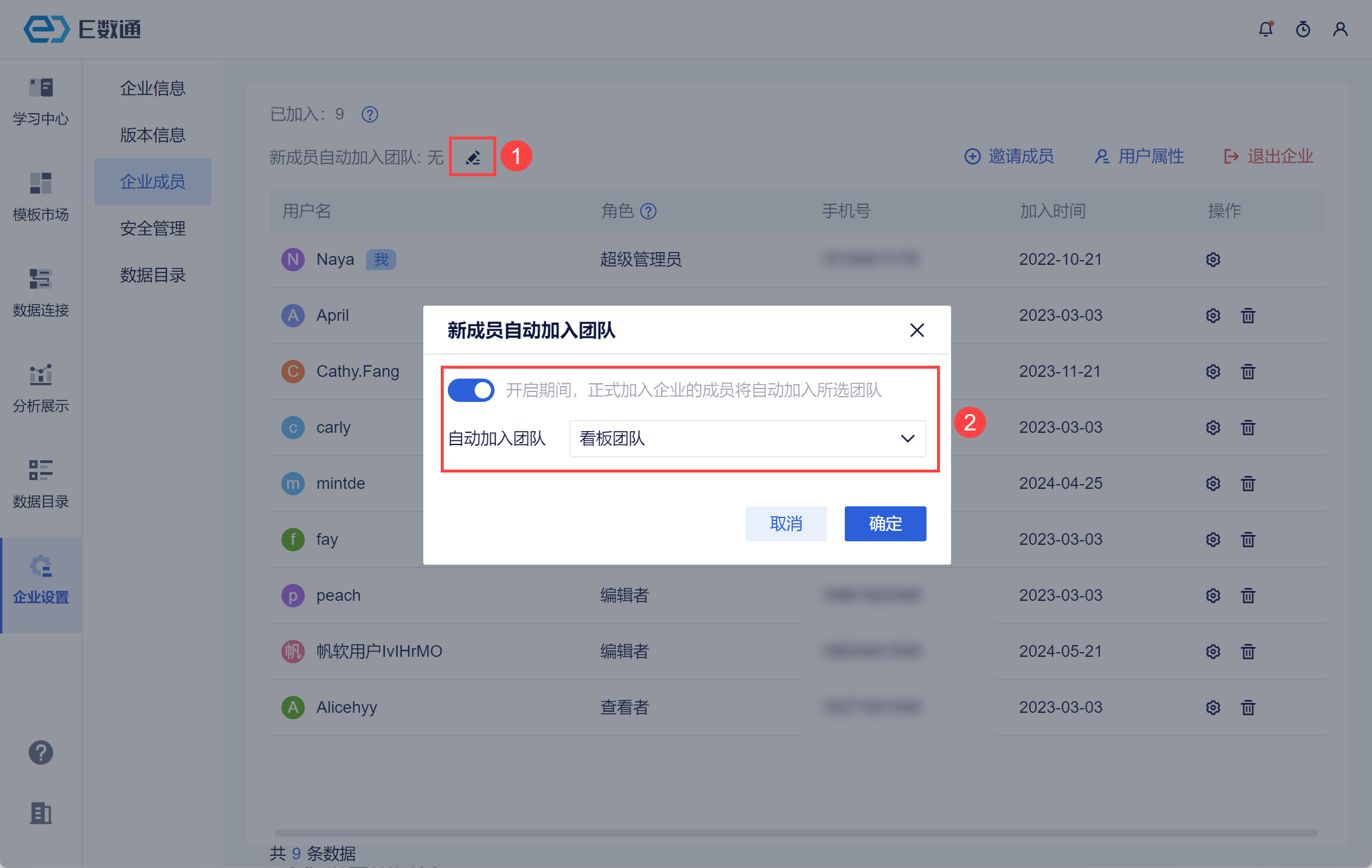 可设置新成员自动加入某个团队,开启这个功能期间,正式加入企业的成员都会自动添加进所选团队。