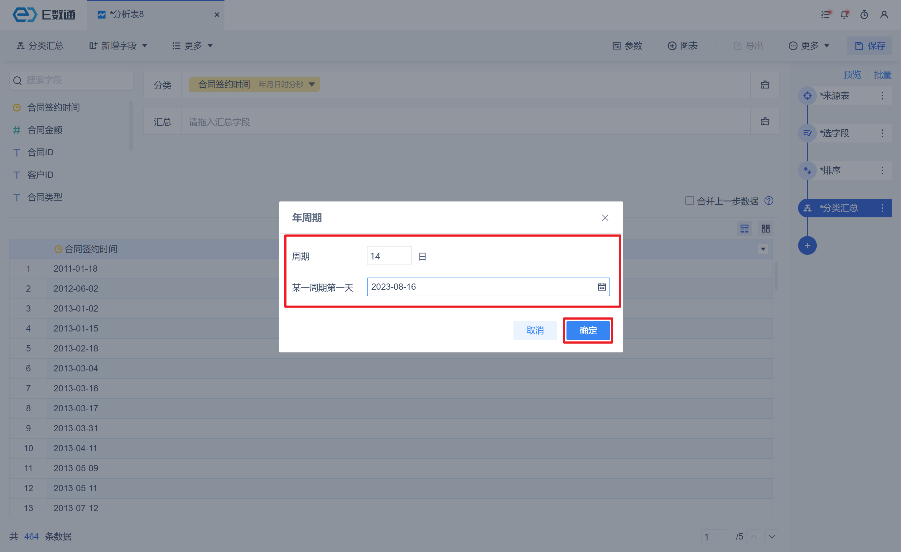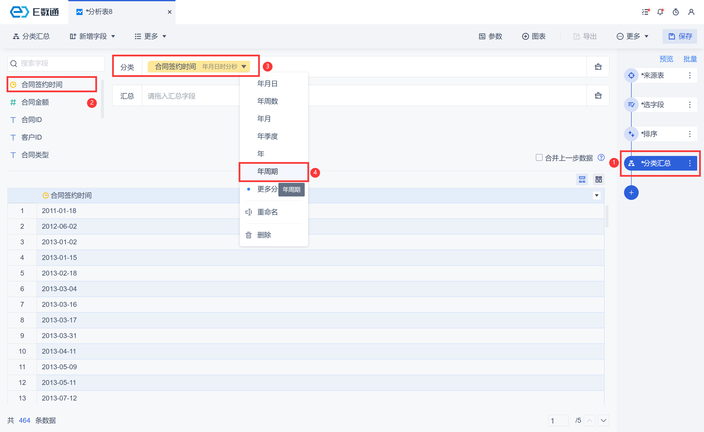 2)特别说明「年周期」,可以自定义起始日期以及周期,以分类汇总步骤为例,拖入一个日期字段,下拉选择「年周期」,如下图所示:
