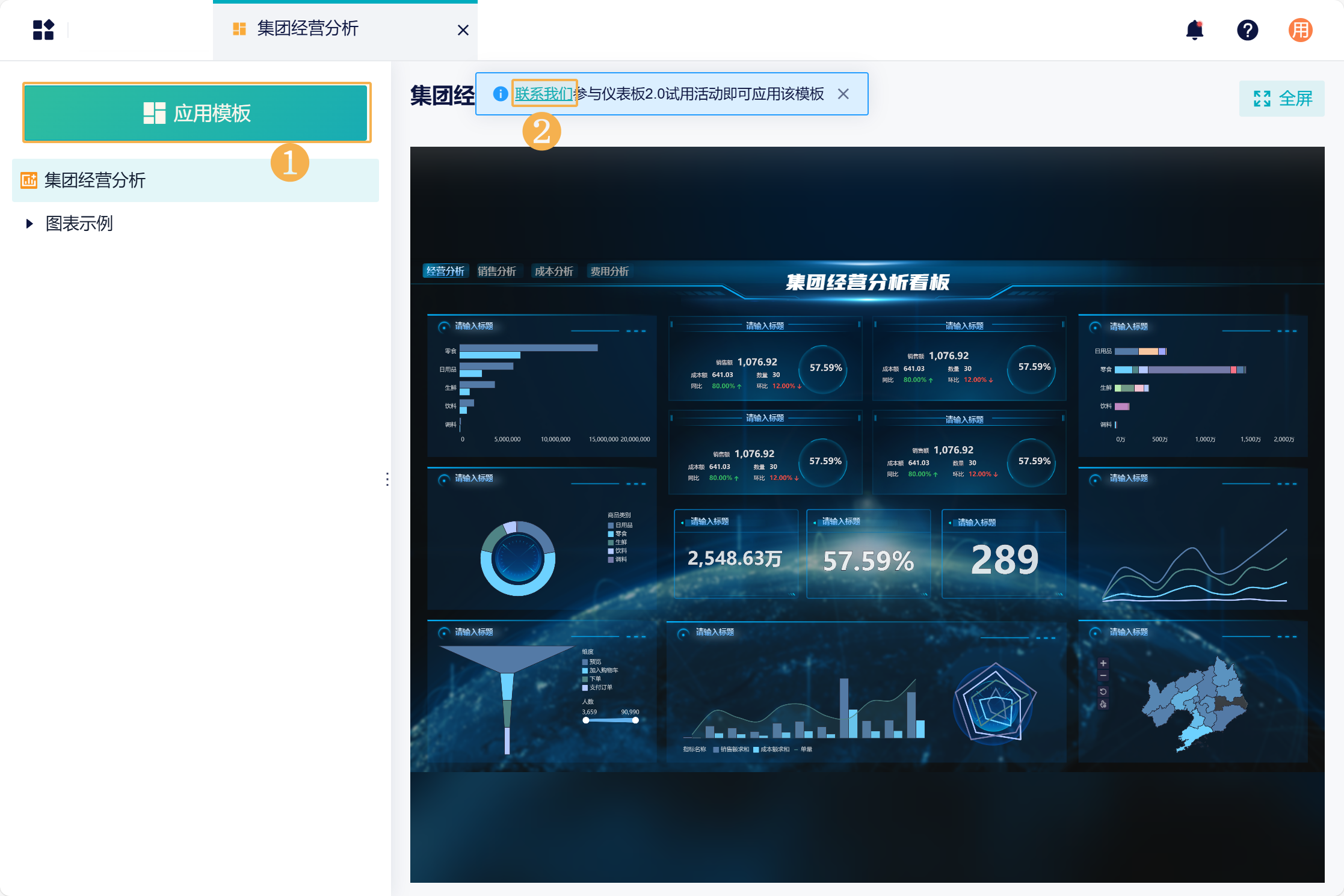 如您想要参与内测,试用仪表板 2.0 ,付费用户请联系技术支持或者商务;免费用户请在应用仪表板 2.0 模板时提交申请,等待相关人员联系您。