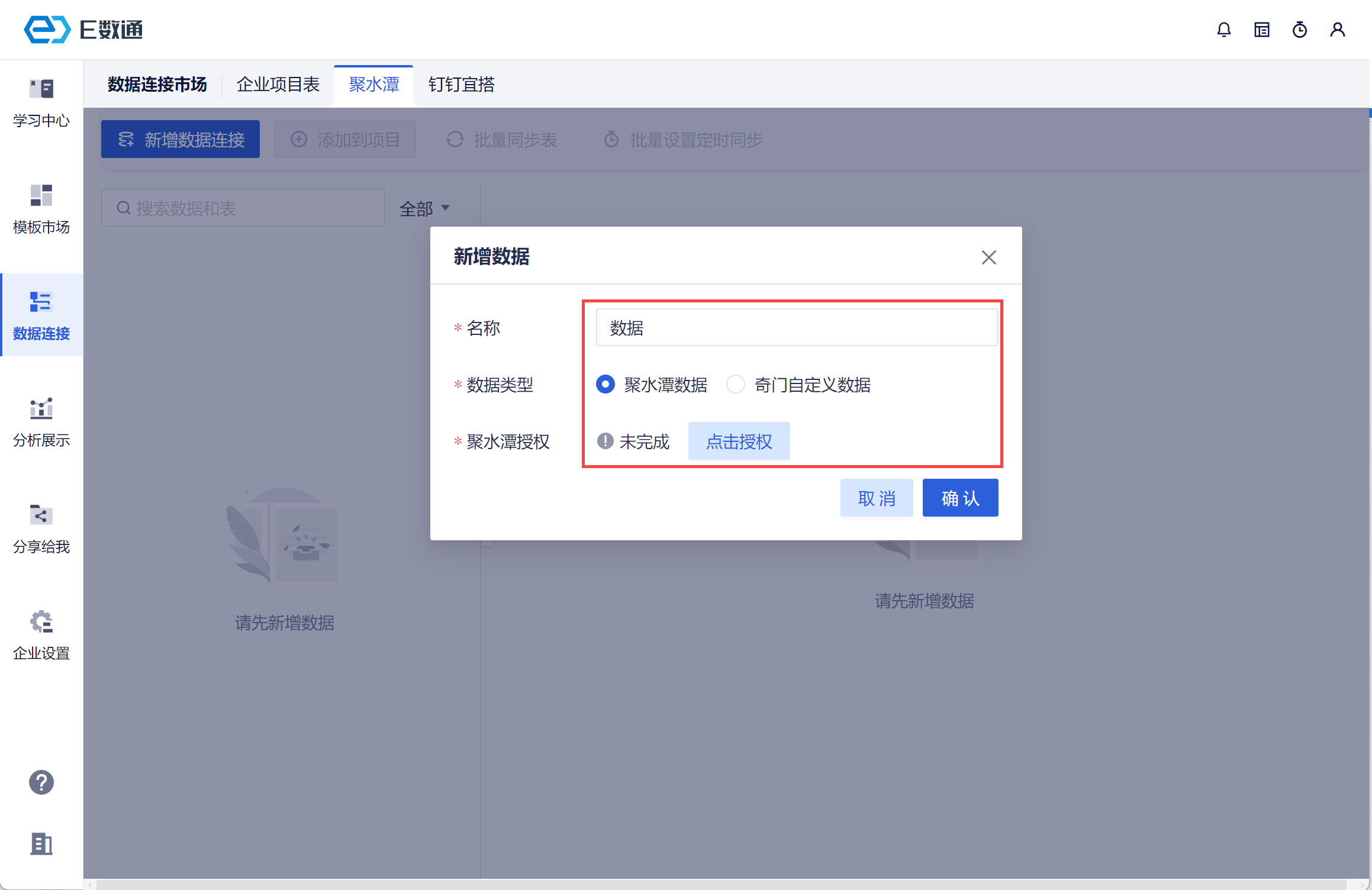 1)进入数据连接市场,新增「聚水潭」数据源;