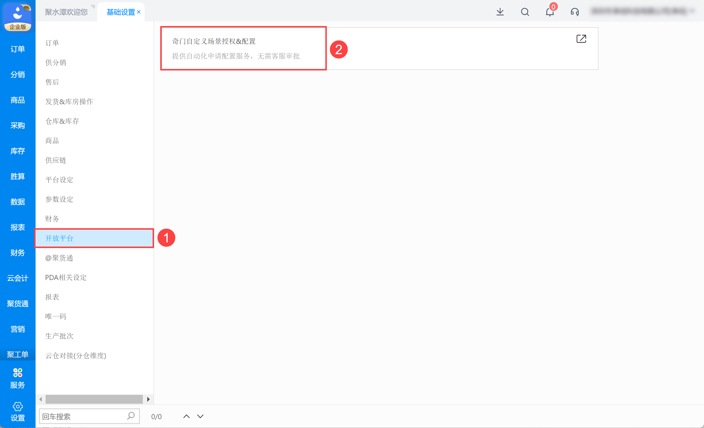 3)点击左侧的「开放平台」,选择「奇门自定义场景授权&配置」。如下图所示: