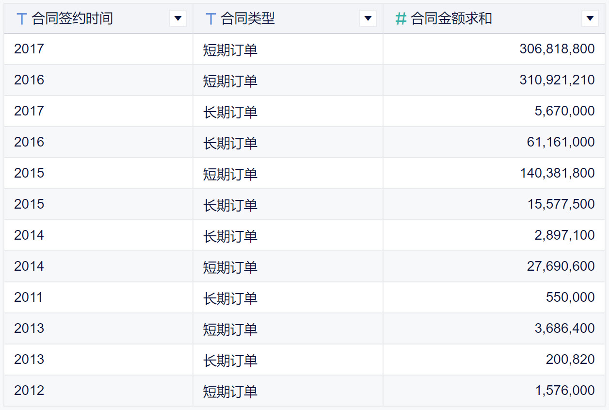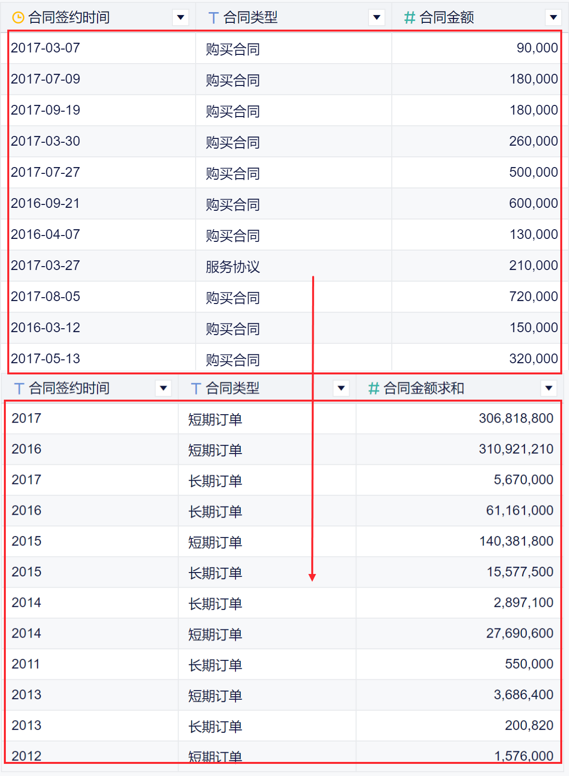例如,用户有一张合同签单表,想将合同类型分为「长期订单」和「短期订单」,并统计每年两种合同类型的合同金额有多少。