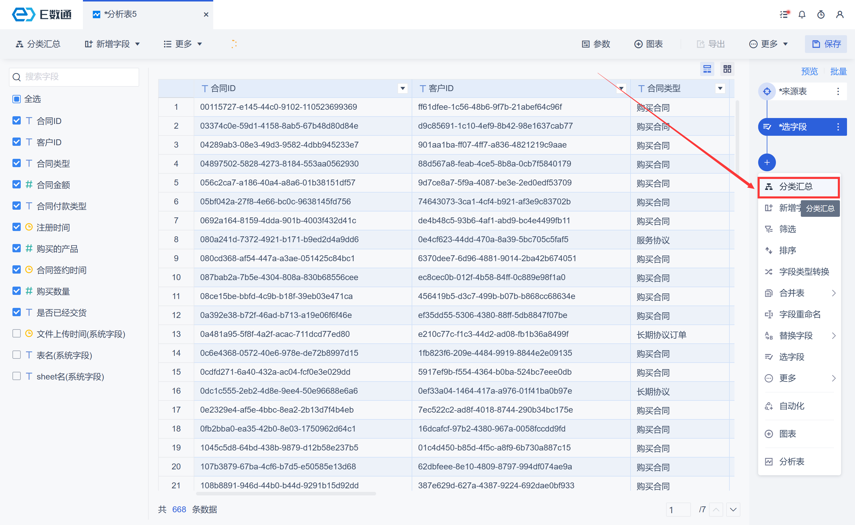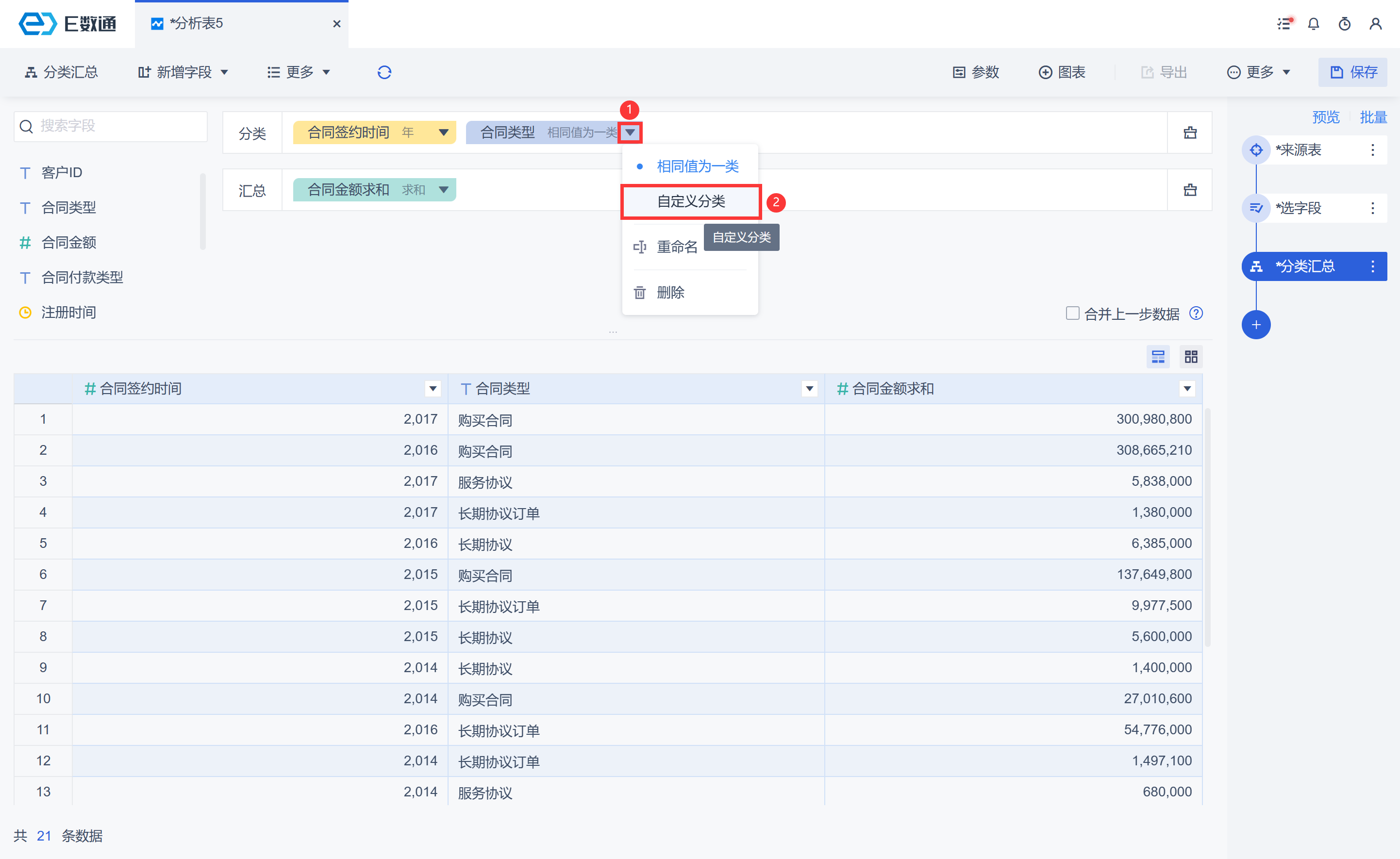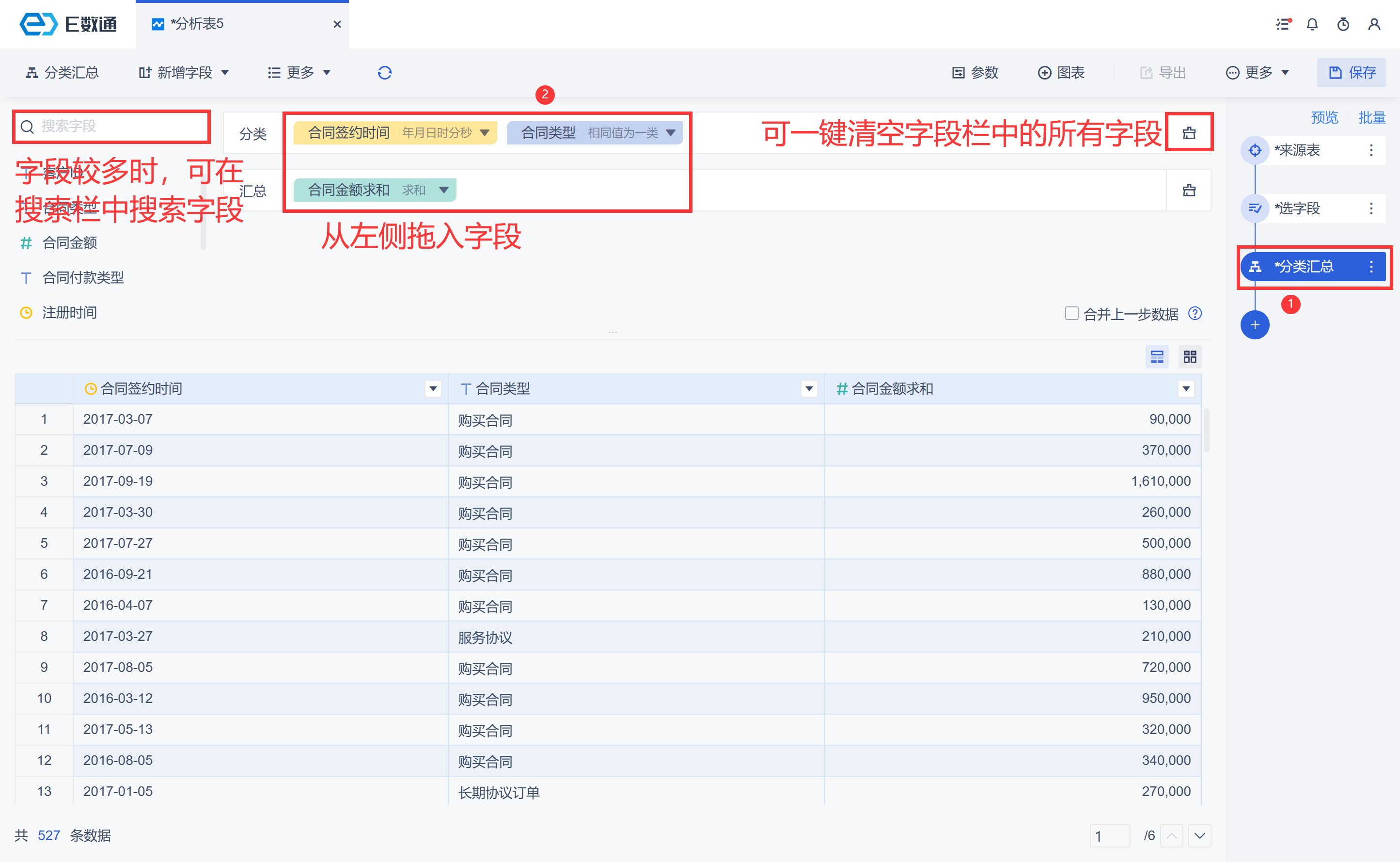 1)添加「分类汇总」步骤,将「合同签约时间」和「合同类型」字段拖入分类栏,将「合同金额」拖入汇总栏。字段较多时,可在搜索栏中搜索字段,如下图所示: