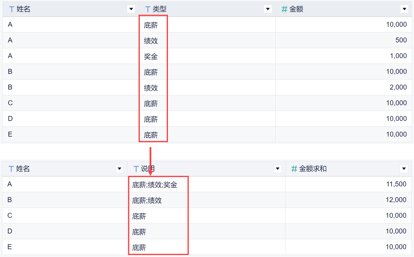 • 拼接后的顺序,在组内自上而下取值。B 的类型从上到下为绩效、绩效、底薪,拼接后的顺序就为 绩效&底薪;A的类型从上到下为 底薪、绩效、奖金,拼接后的顺序就为 底薪&绩效&奖金;