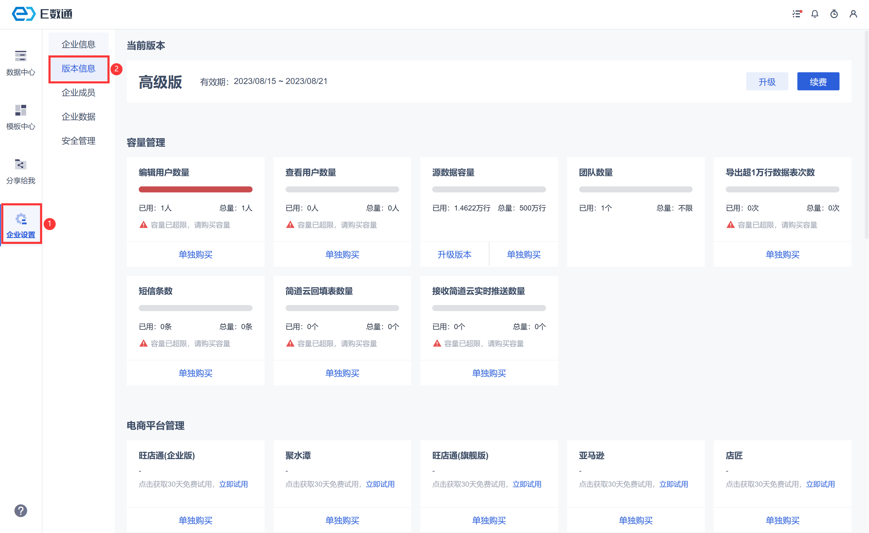 E数通「免费版」可以立即使用,「高级版」可免费试用 7 天,如下图所示: