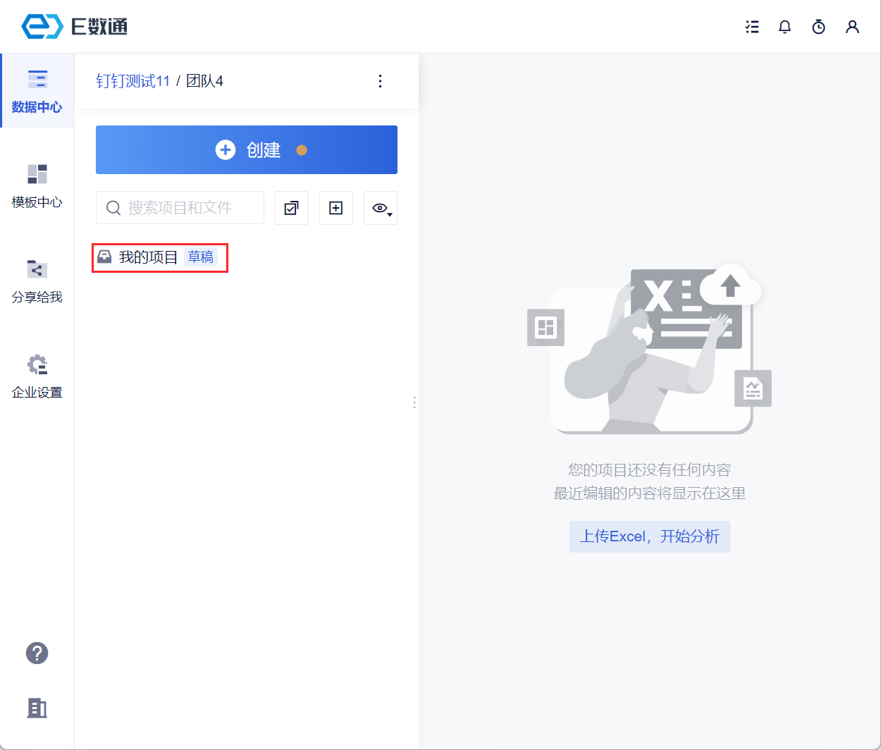 2)进入E数通后,会在企业下自动创建一个团队以及团队下的项目,团队名为 XXX(用户名)的团队。