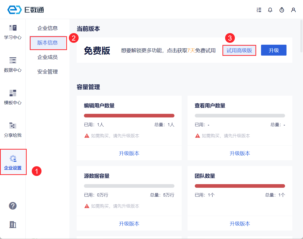 当前创建的企业是免费版的,可以在「版本管理」中获取 7 天的高级版试用。如果您需要更多功能的试用,可联系对应的销售经理。