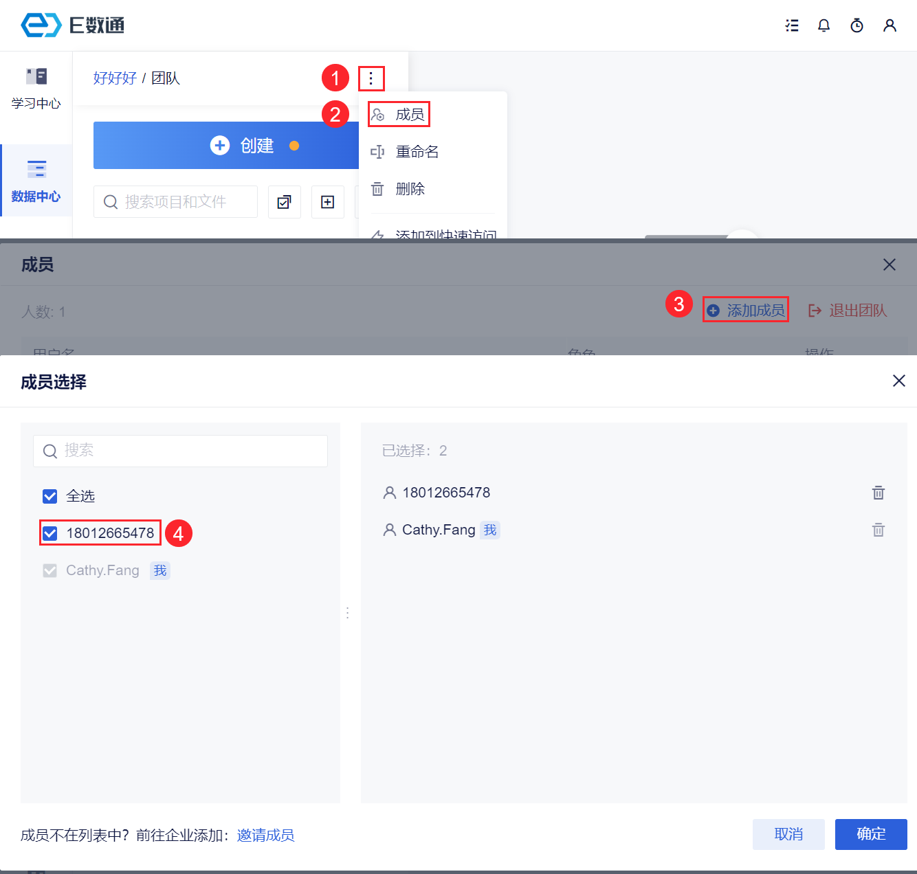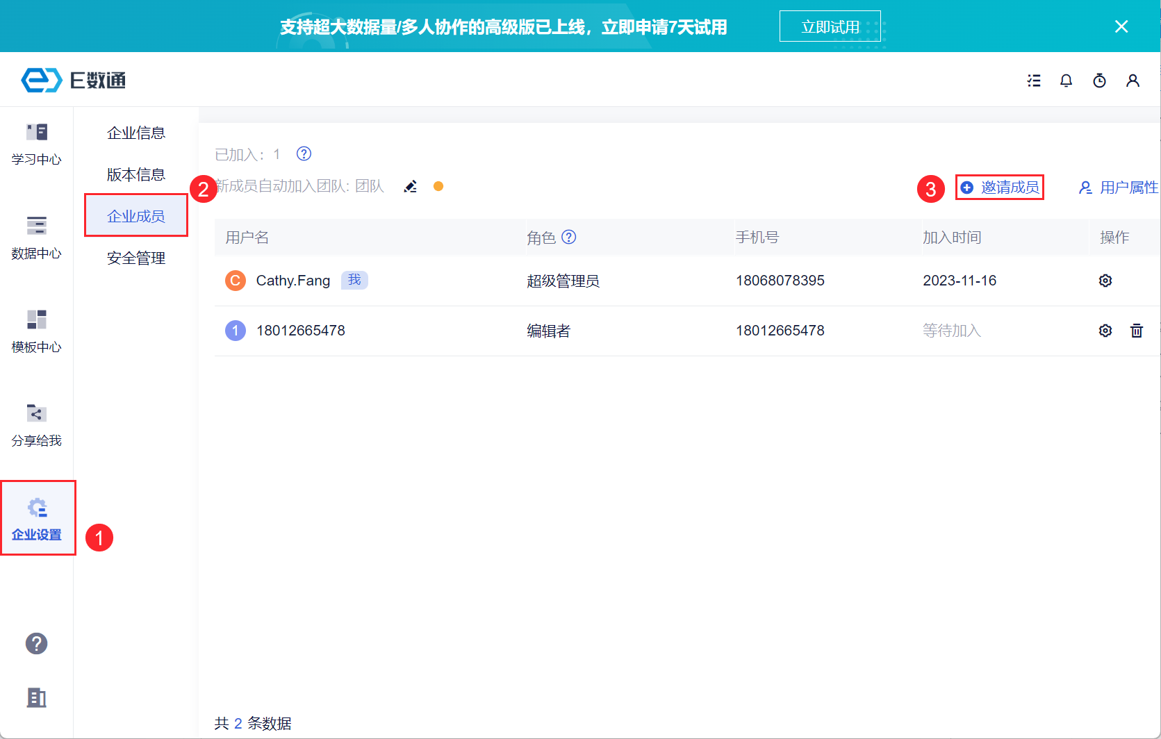 1)可以邀请其他成员进入我的团队中查看我做的一些分析,共享数据结果。按照以下步骤邀请其他成员进入我的企业。如下图所示: