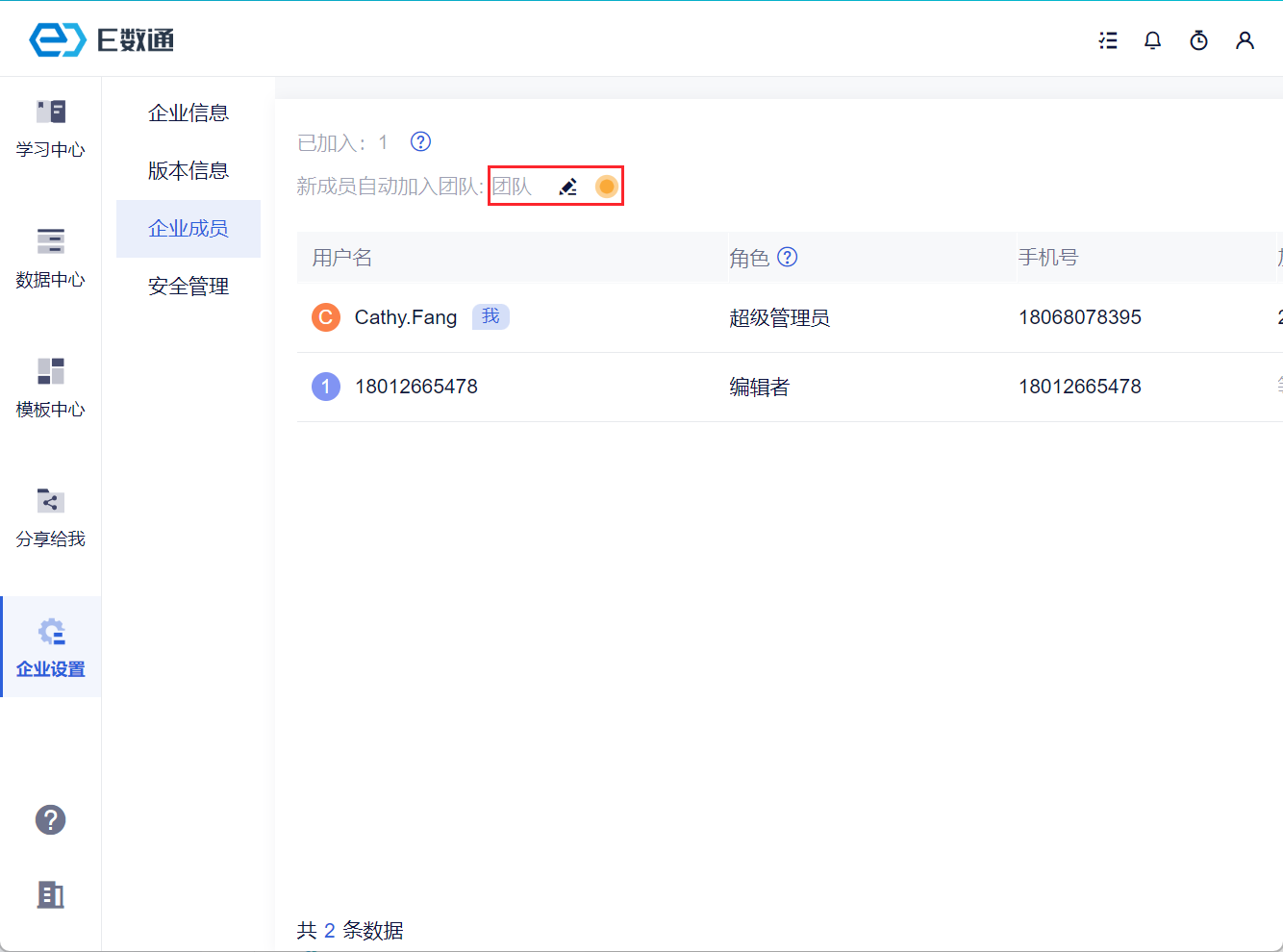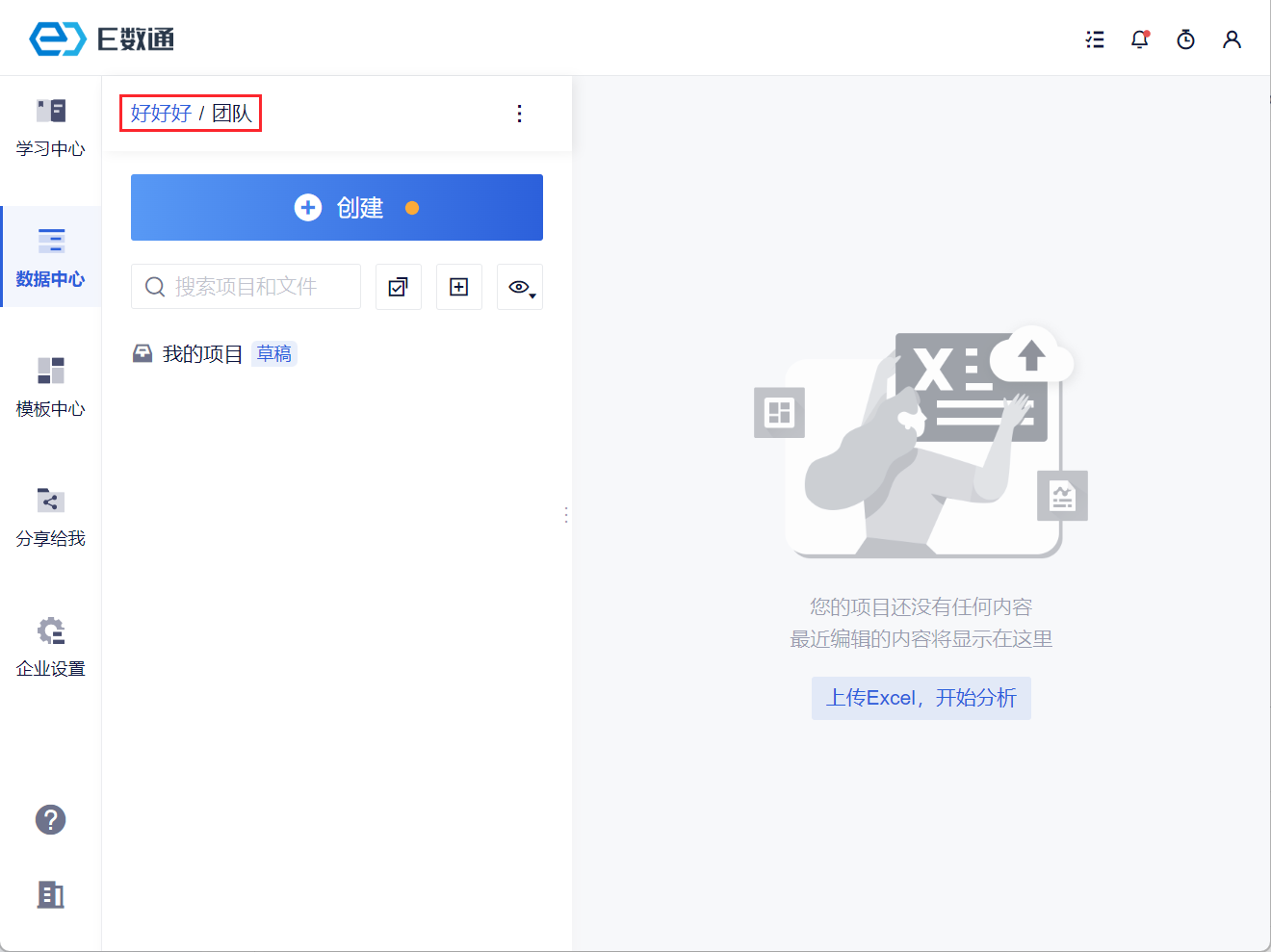 数据中心 的层级可分为:企业->团队->项目,可点击跳转到不同的层级中查看。可参考 E数通界面介绍 进行学习。
