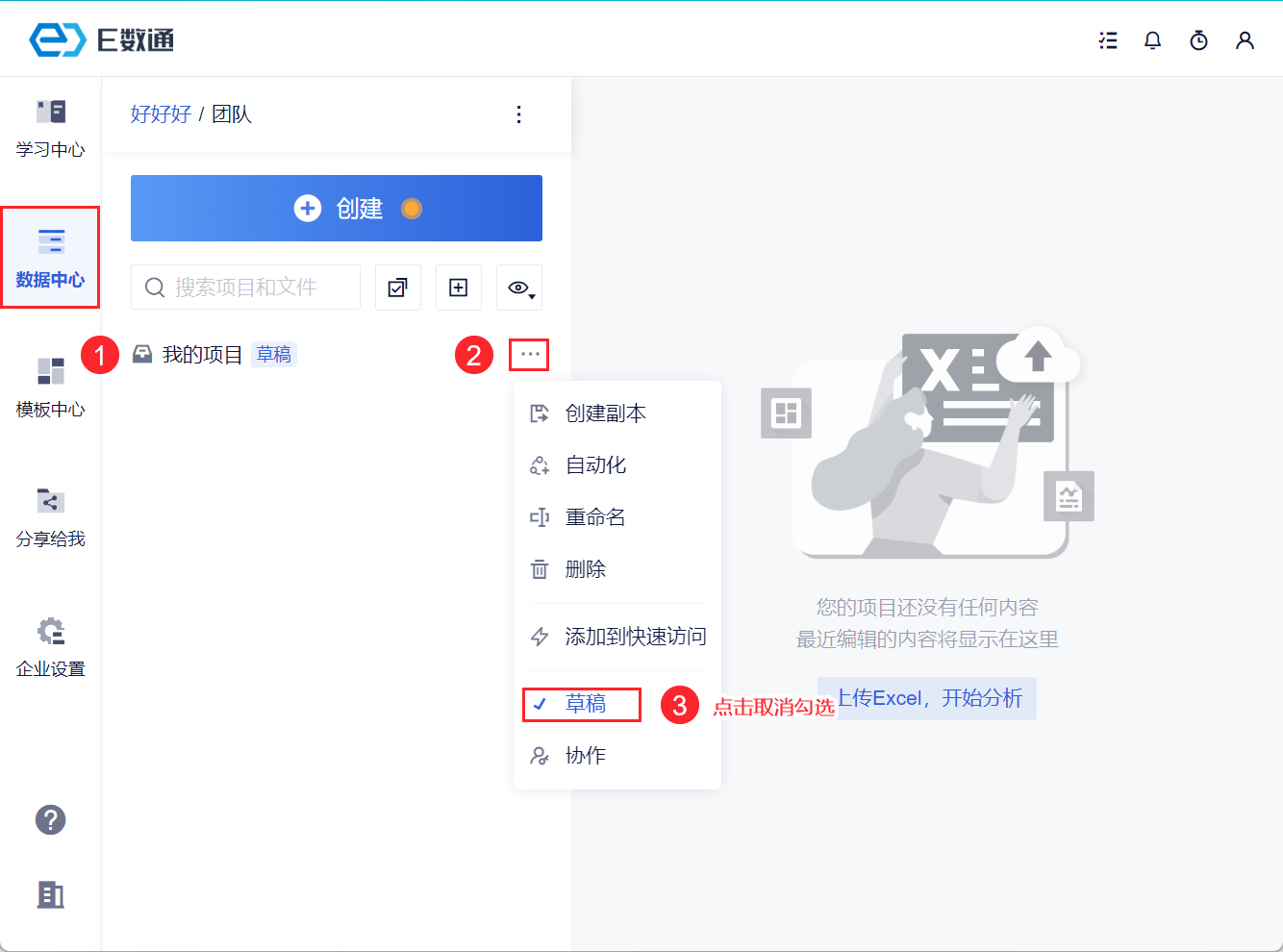2)如果你已经做好了分析,想要给进入团队的成员查看,可以取消「草稿」标签,告诉团队成员这个项目中的数据是已经处理好的。如下图所示