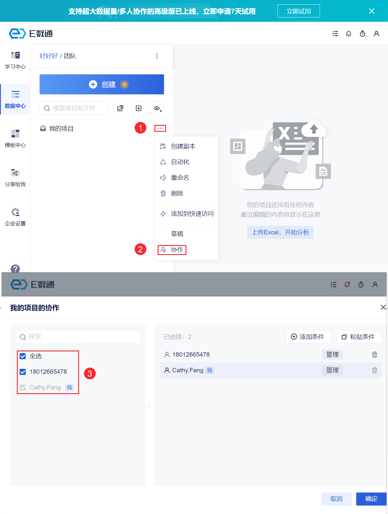 我在项目中已经做了一些分析,团队中的成员想要在我的基础上继续做一些分析。这时,我可以把项目协作给他,让他和我一起编辑项目中的数据。如下图所示: