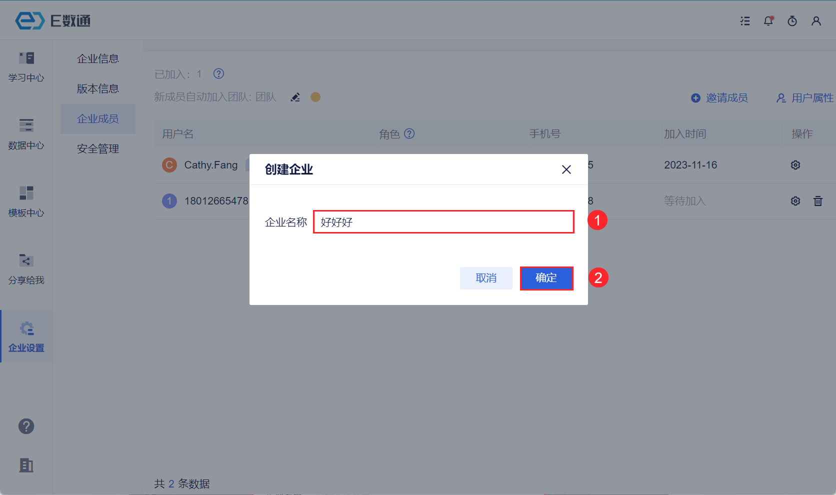 1)登录后进行创建企业界面,设置自己企业的名称并填写相关信息,点击「进入E数通」,如下图所示:
