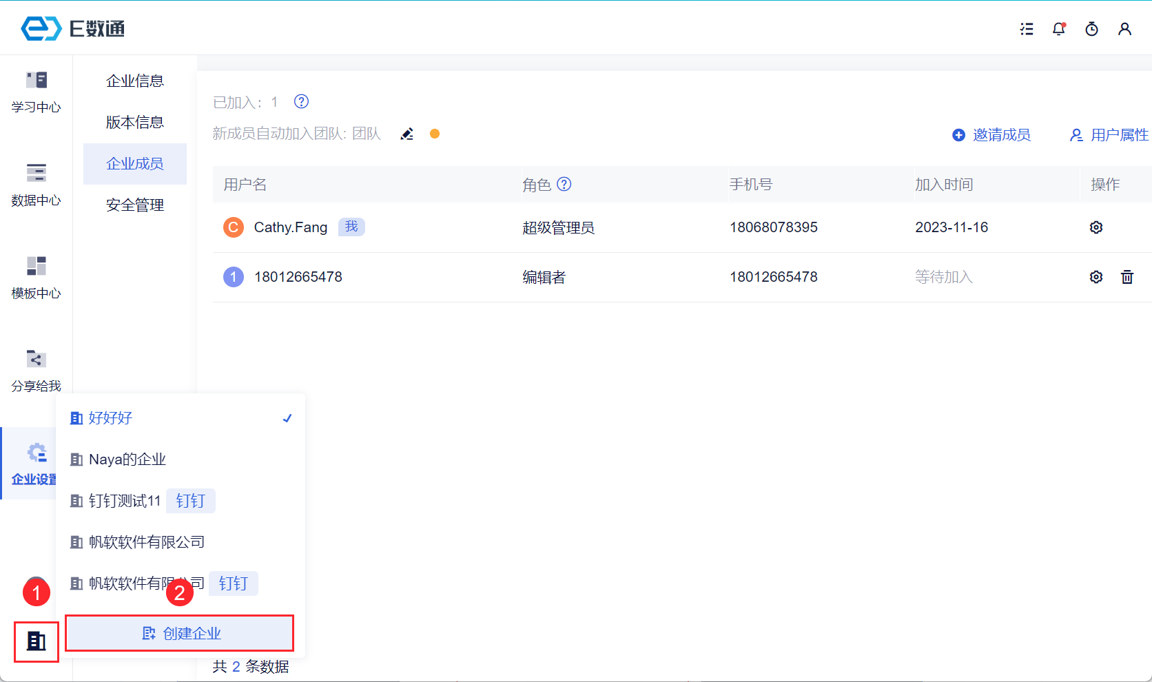 1)可以邀请成员加入自己的企业,点击「企业设置>企业成员」,点击「邀请成员」。如下图所示: