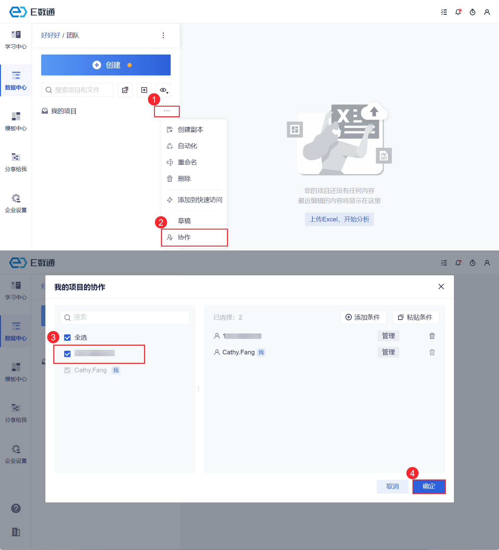 我在项目中已经做了一些分析,团队中的成员想要在我的基础上继续做一些分析。这时,我可以把项目协作给他,让他和我一起编辑项目中的数据。如下图所示: