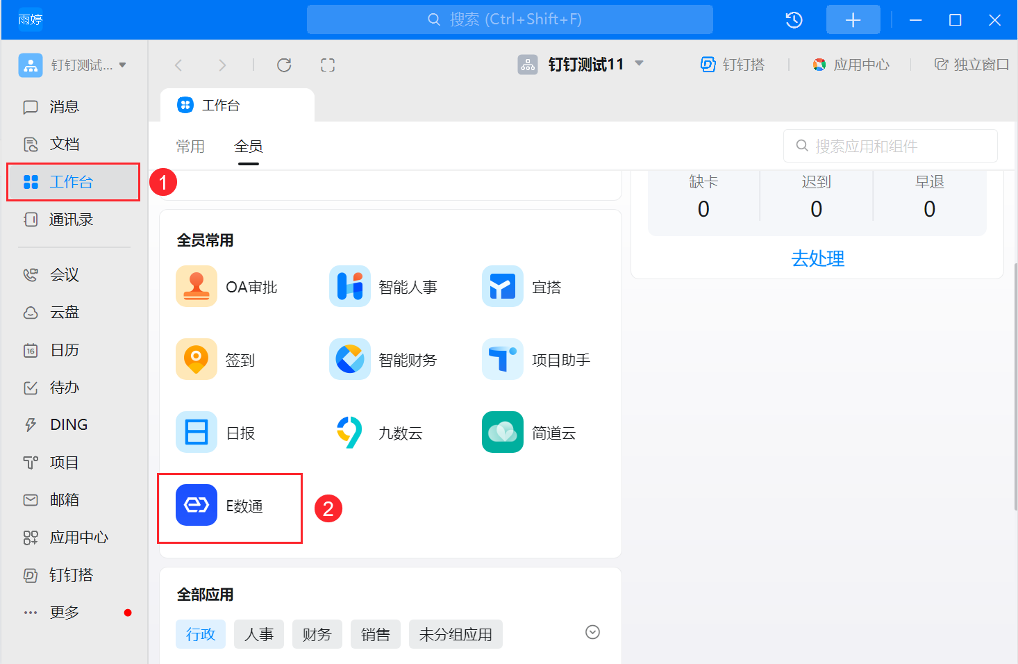 与浏览器登录相比,钉钉登录E数通的入口有所不同,下面将介绍钉钉中使用E数通的相关内容。
